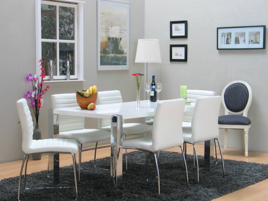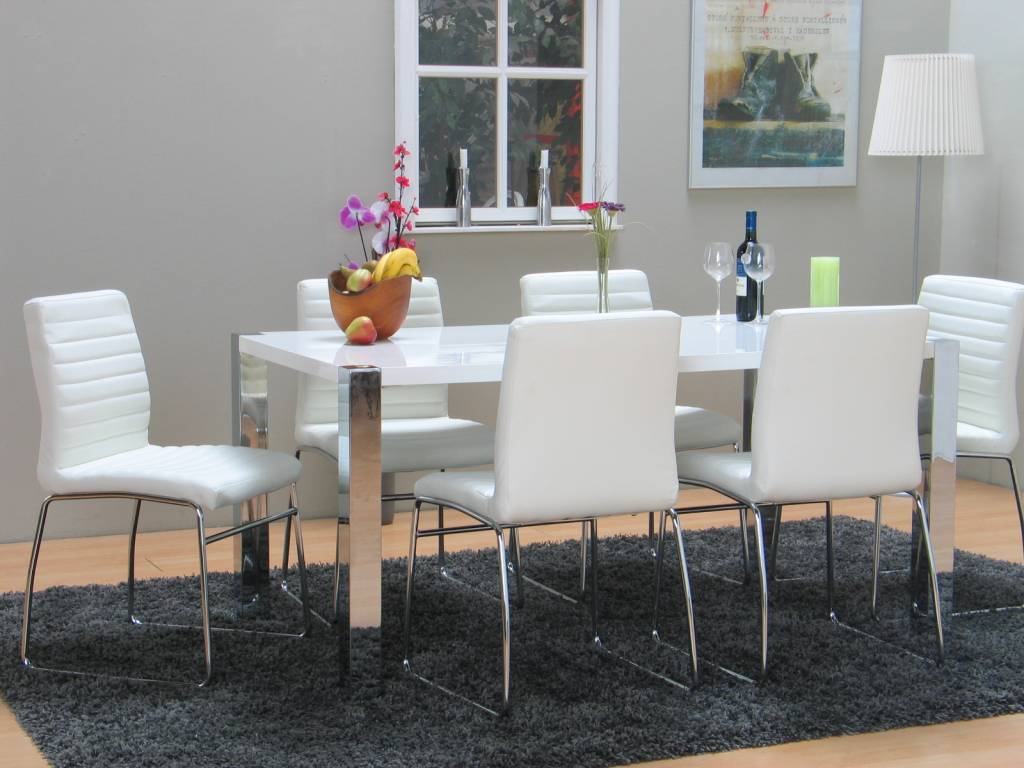 Eethoek Amy: een witte hoogglans tafel in combinatie met 6 witte stoelen Denver. Helder witte eethoek om van te genieten, zowel van een afstand als aan tafel zelf!