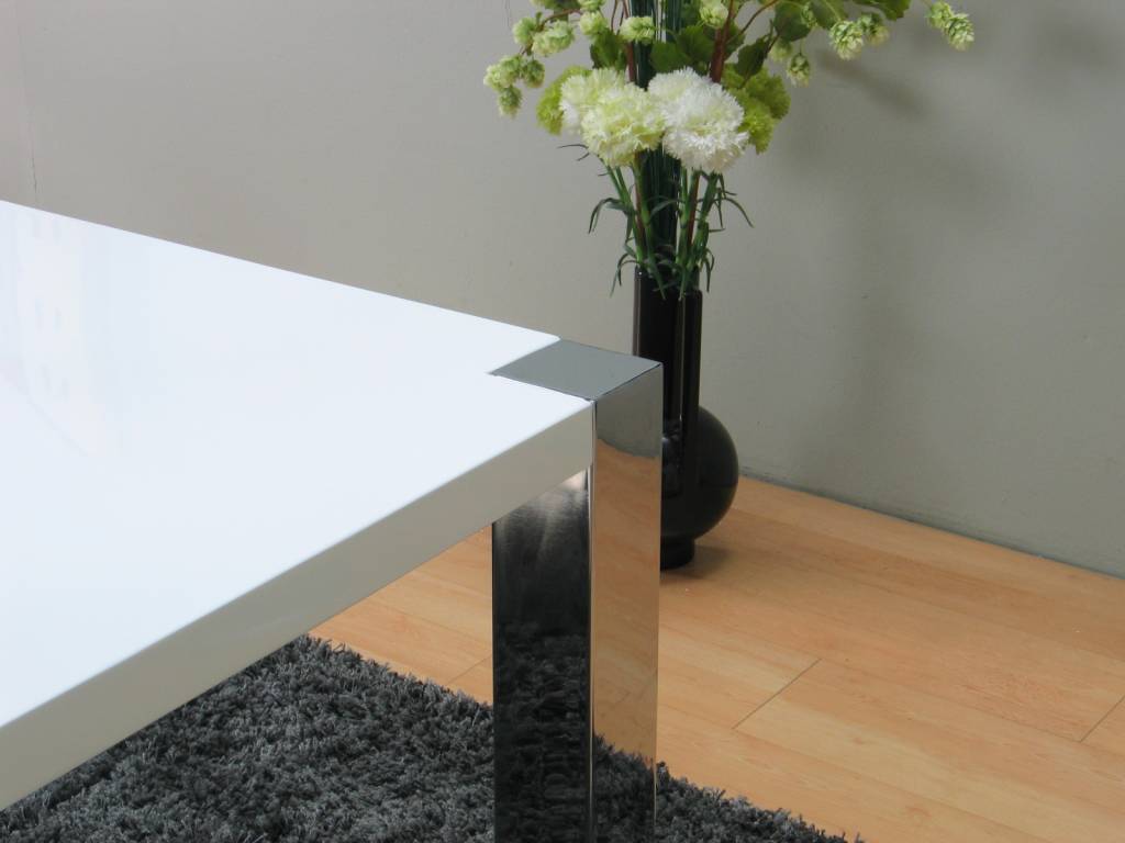 - Witte tafel, hoogglans gelakt met een verchroomd metalen onderstel