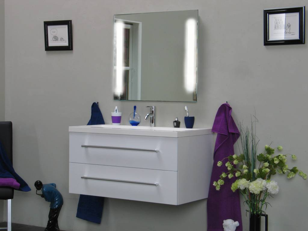 Badkamermeubel Sara, wit hoogglans met spiegel en verlichting! Ook verkrijgbaar als set van 2 meubelen, dus met 2 wastafels en 2 spiegels.