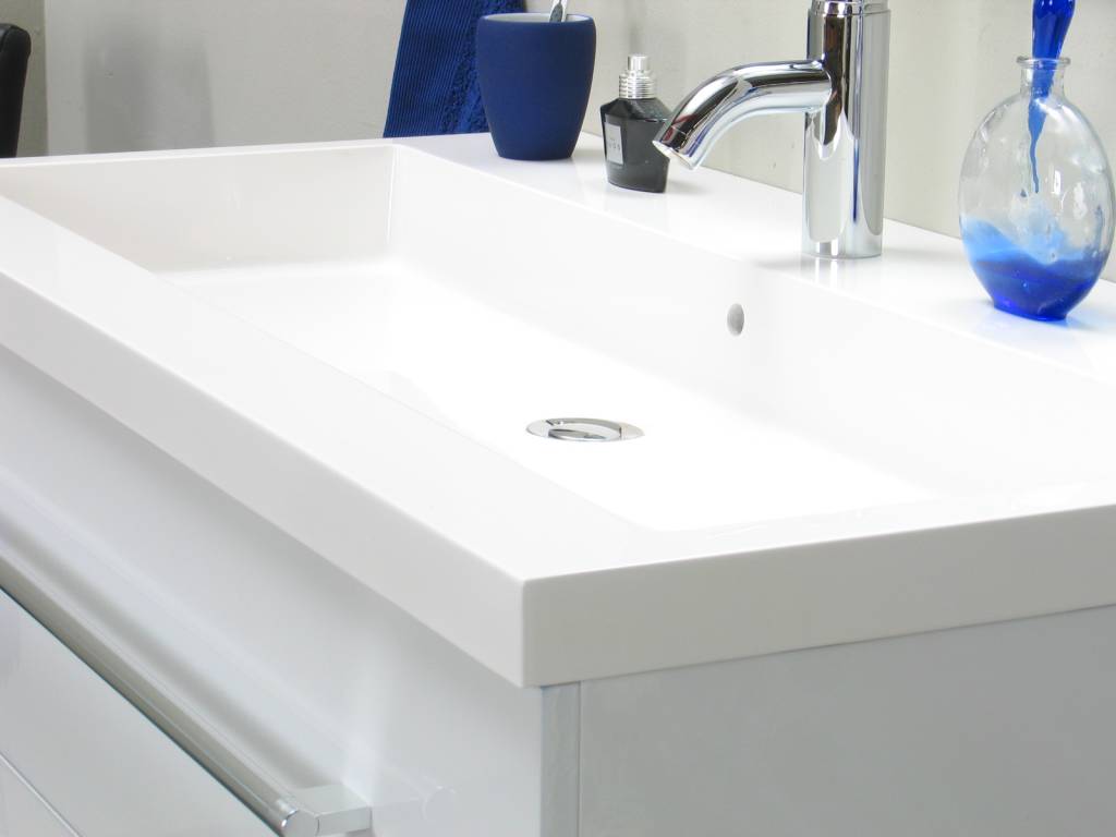 - Wastafel van wit gietmarmer (hard kunststof) met overloop, zonder afvoer en kraan