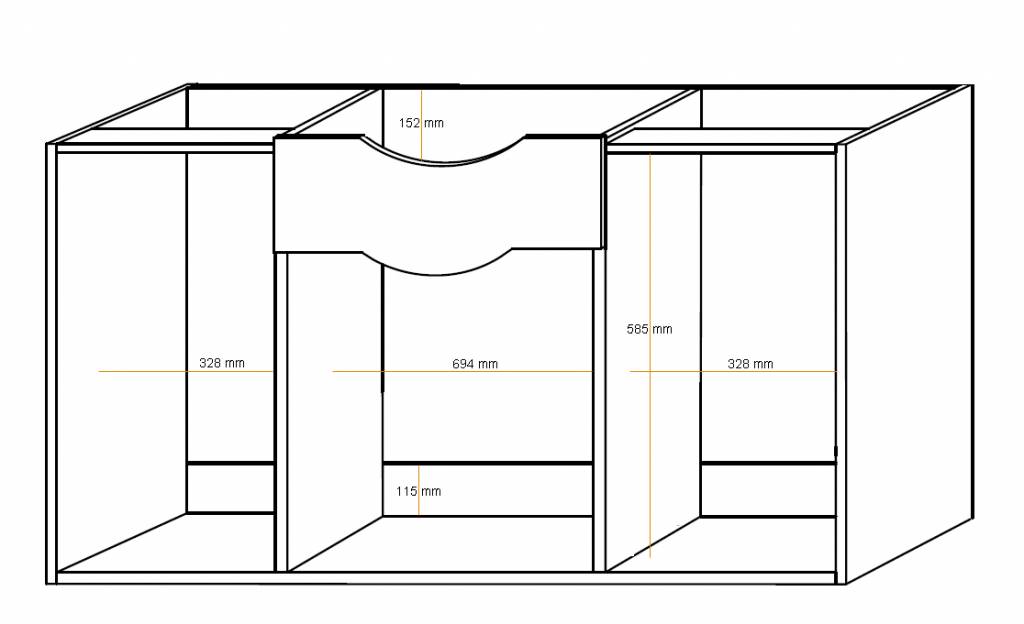Wastafelonderkast: achter de linker- en rechterdeur 1 groot vak, achter de 2 middelste deuren 1 groot vak