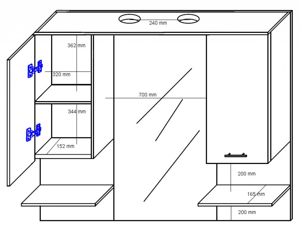 Kasten links en rechts van de spiegel: 1 plank in de kast, spiegel en 1 plank onder de kast