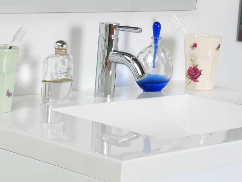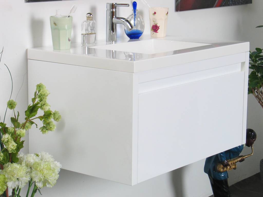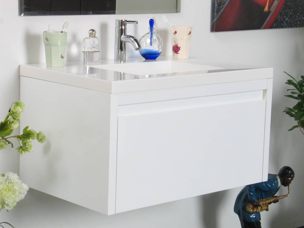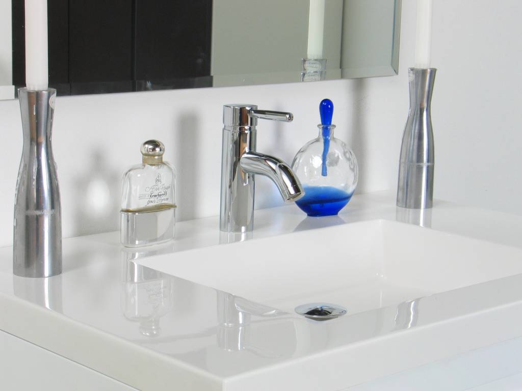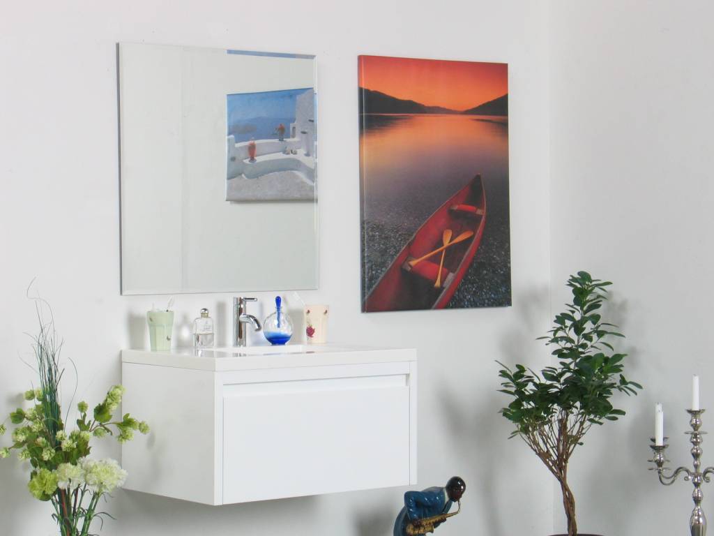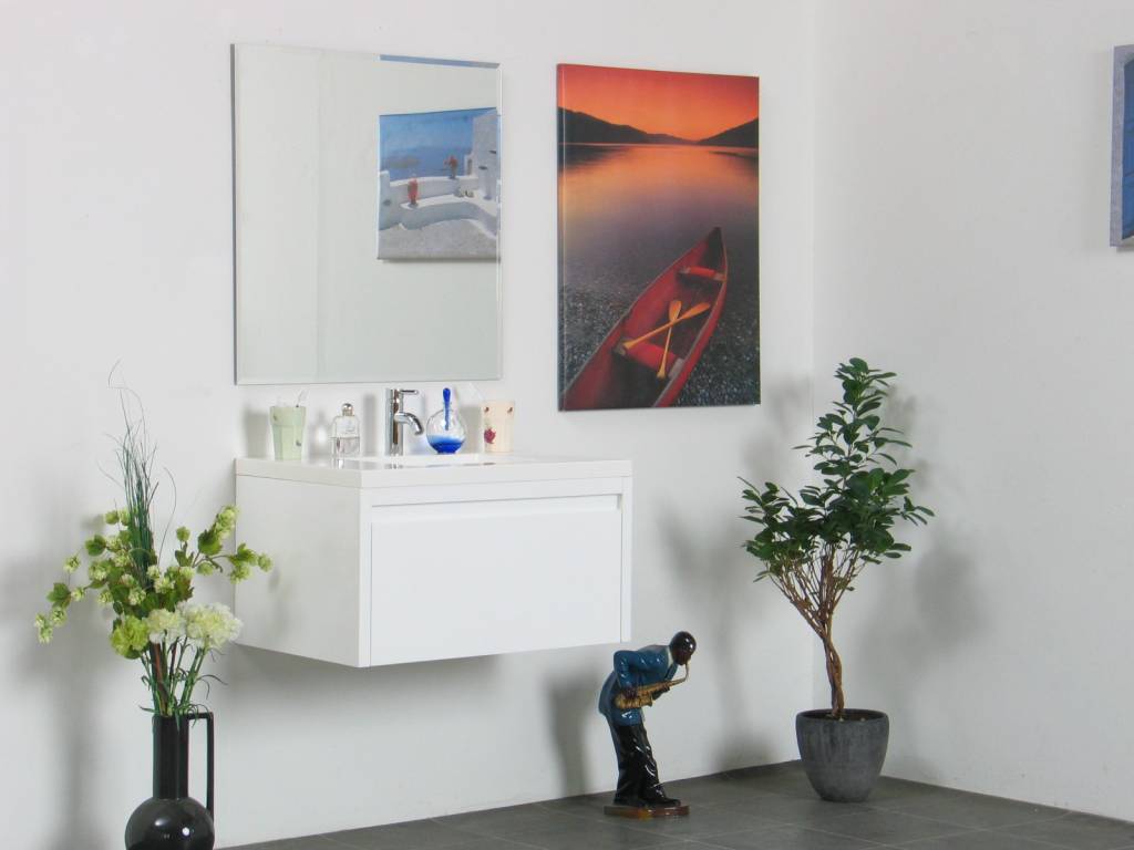 Stuntprijs! Ver beneden de aanbevolen verkoopprijs, dus sla uw slag! Mooi, stijlvol design, uitgevoerd in hoogglans wit. De set bestaat uit een wastafelonderkast van MDF met wastafel van gietmarmer en een facetgeslepen spiegel.