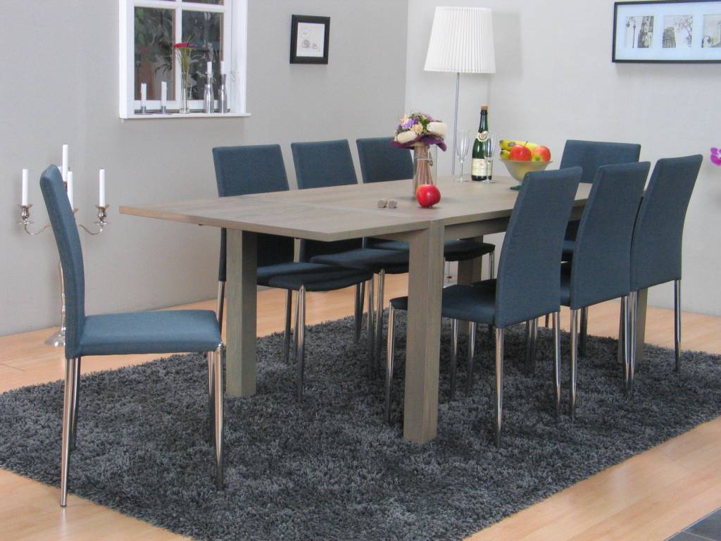 Eethoek Boston, een tafel in grijs gebeitst eiken van 160x90cm met aansteekplaat om te verlengen tot 210 cm, en compleet met 8 donkergroene stoelen Tiana!