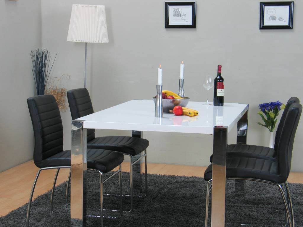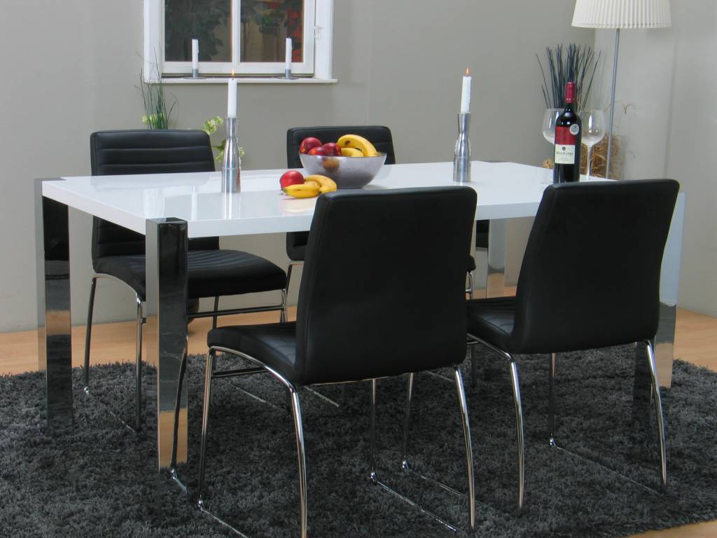 Complete set voor in de eetkamer! Deze stijlvolle combinatie bestaat uit 4 zwarte Denver-stoelen en een tafel uitgevoerd in wit hoogglans.
