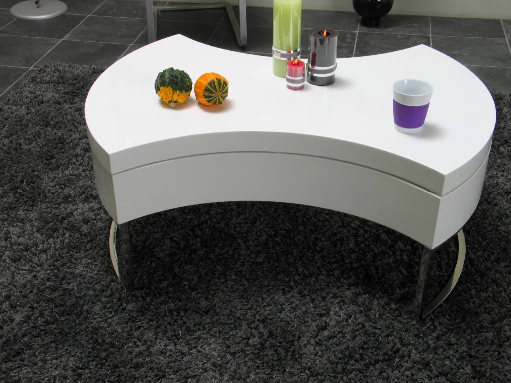 Salontafel met draaibaar tafelblad, gemaakt van wit hoogglans gelakt hout en met een verchroomd metalen onderstel. Praktisch in gebruik en toch erg stijlvol!