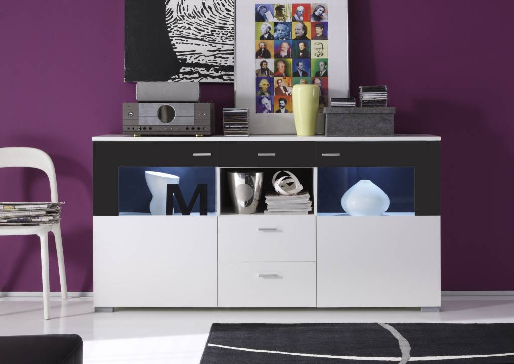 Wit dressoir Manhattan, 170 cm breed en 86 cm hoog, met glazen vensters en een antracietgrijze lijst. In het dressoir kunt u optioneel LED verlichting plaatsen, los te koop in onze shop!