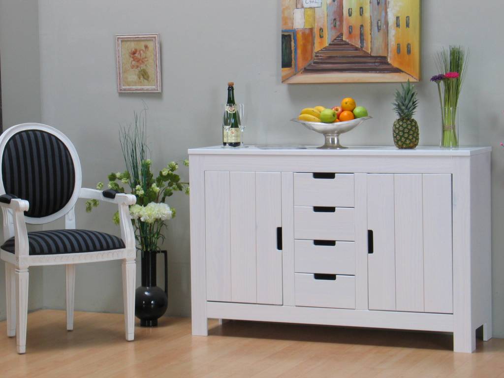 Massief grenen dressoir in de serie Stockholm. Dit mooie, stevige meubel is wit gelakt en past perfect in de woonkamer of slaapkamer. Dit dressoir past goed bij de overige meubelen uit de gelijknamige serie.