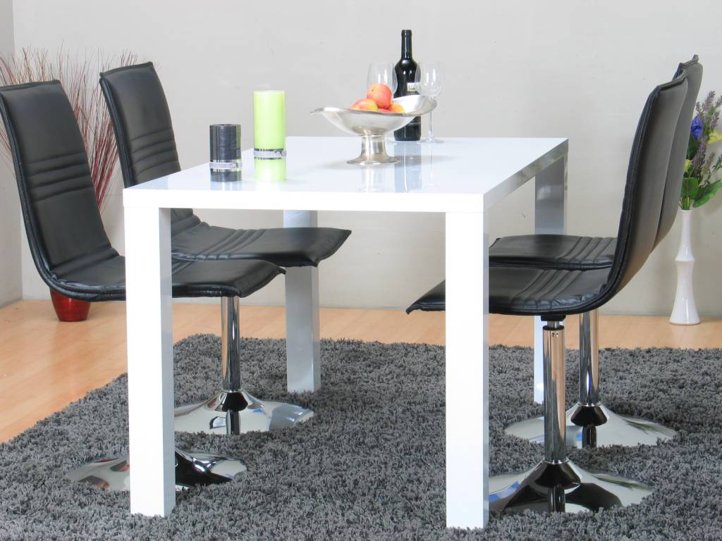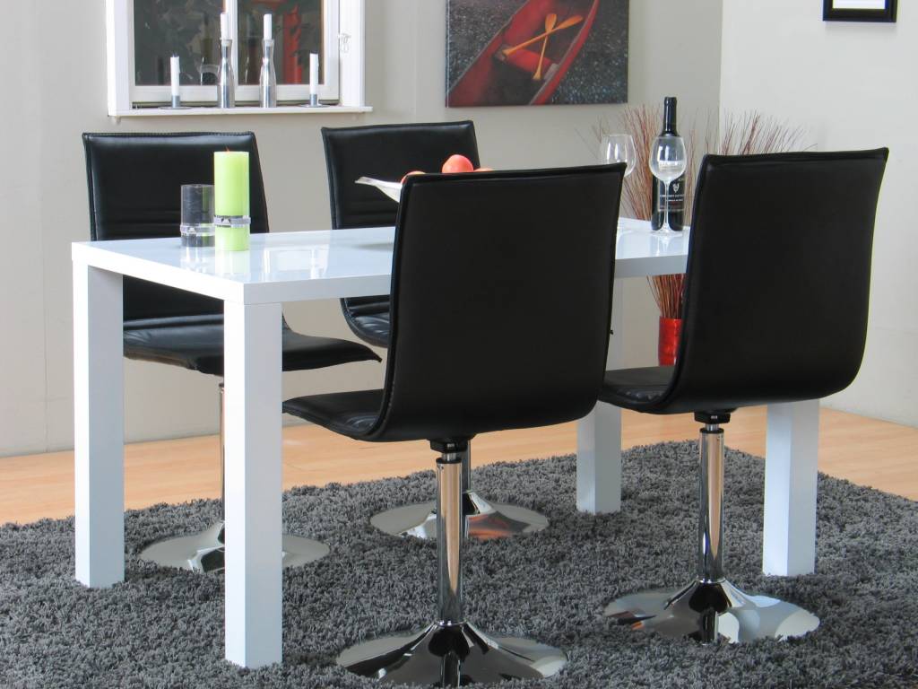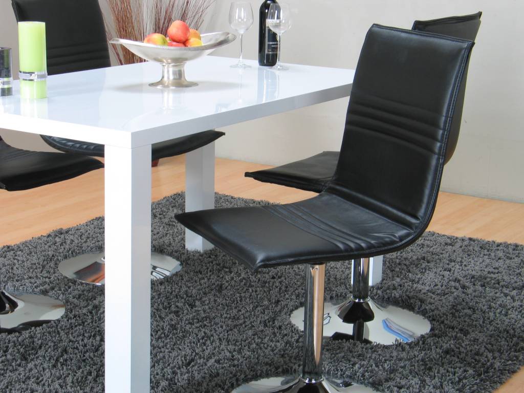 Stijlvolle eethoek bestaande uit een wit hoogglans tafel met 4 zwarte kunstlederen draaistoelen. Ideaal voor in huis, de kantine of op kantoor. Nu met een voordelige setprijs!