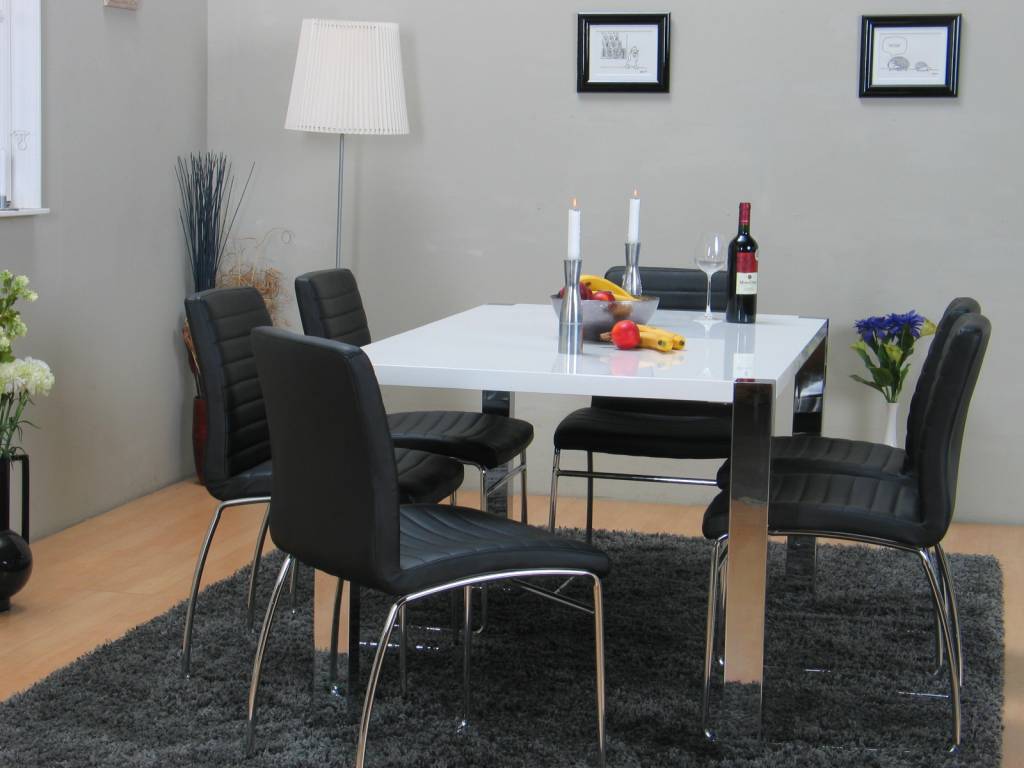 Eethoek, bestaande uit onze witte design tafel Jason en 6 stoelen uit de serie Denver. Nu te koop voor een scherpe setprijs!