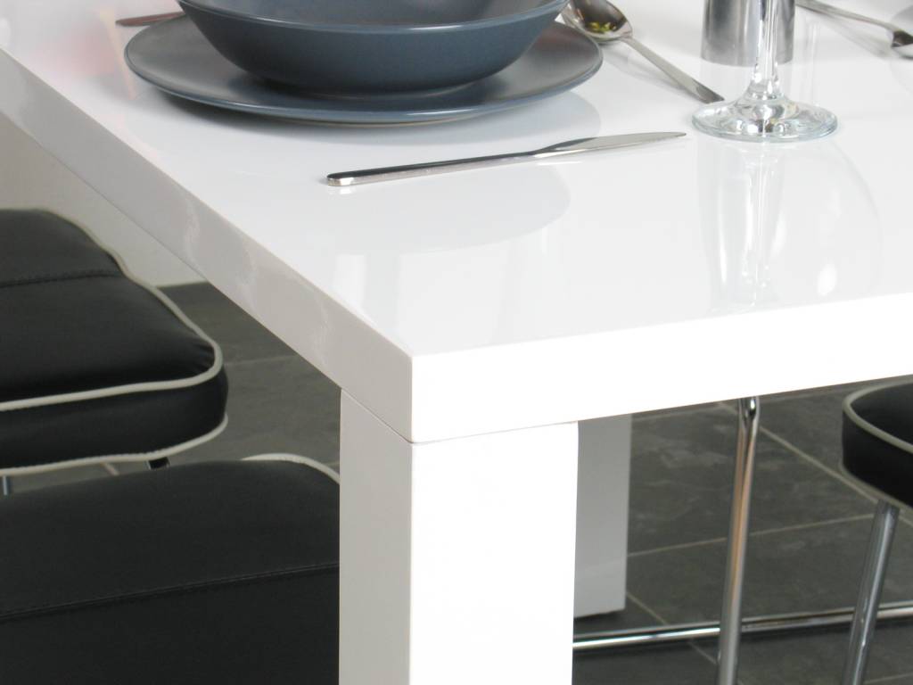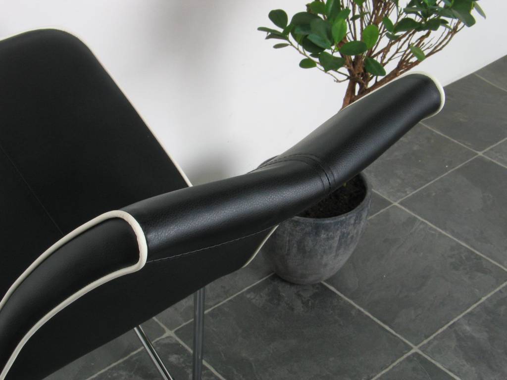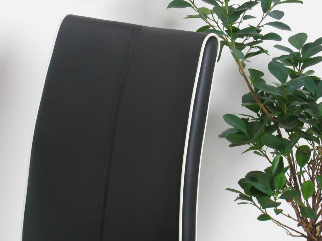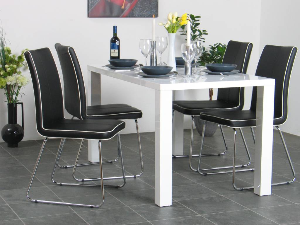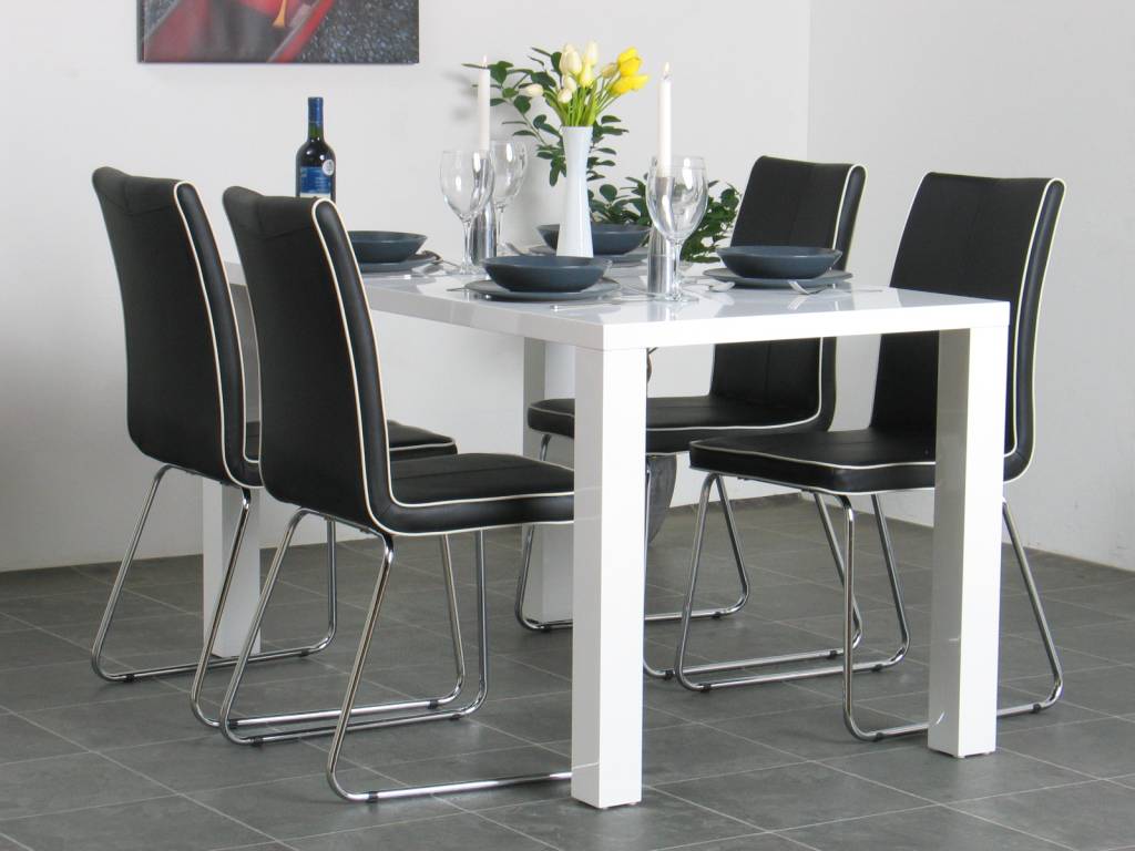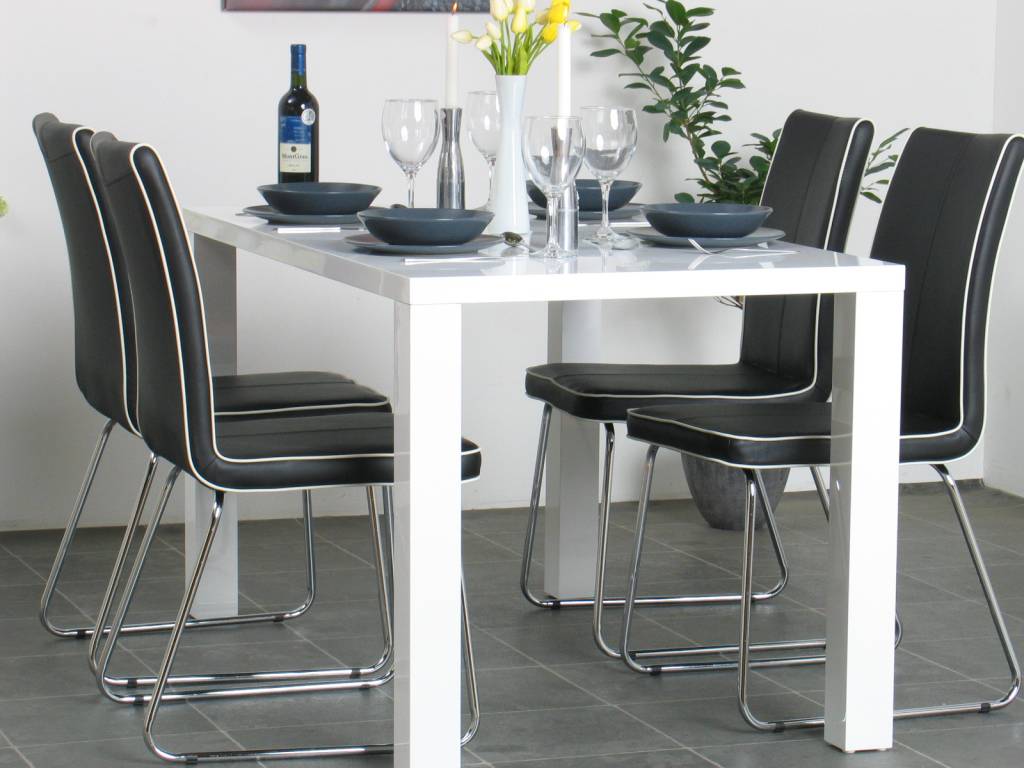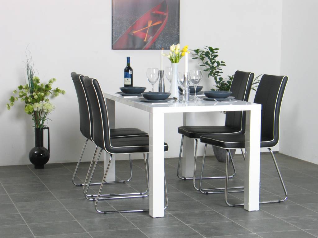 Zwarte stoelen met witte afwerking, witte hoogglans tafel