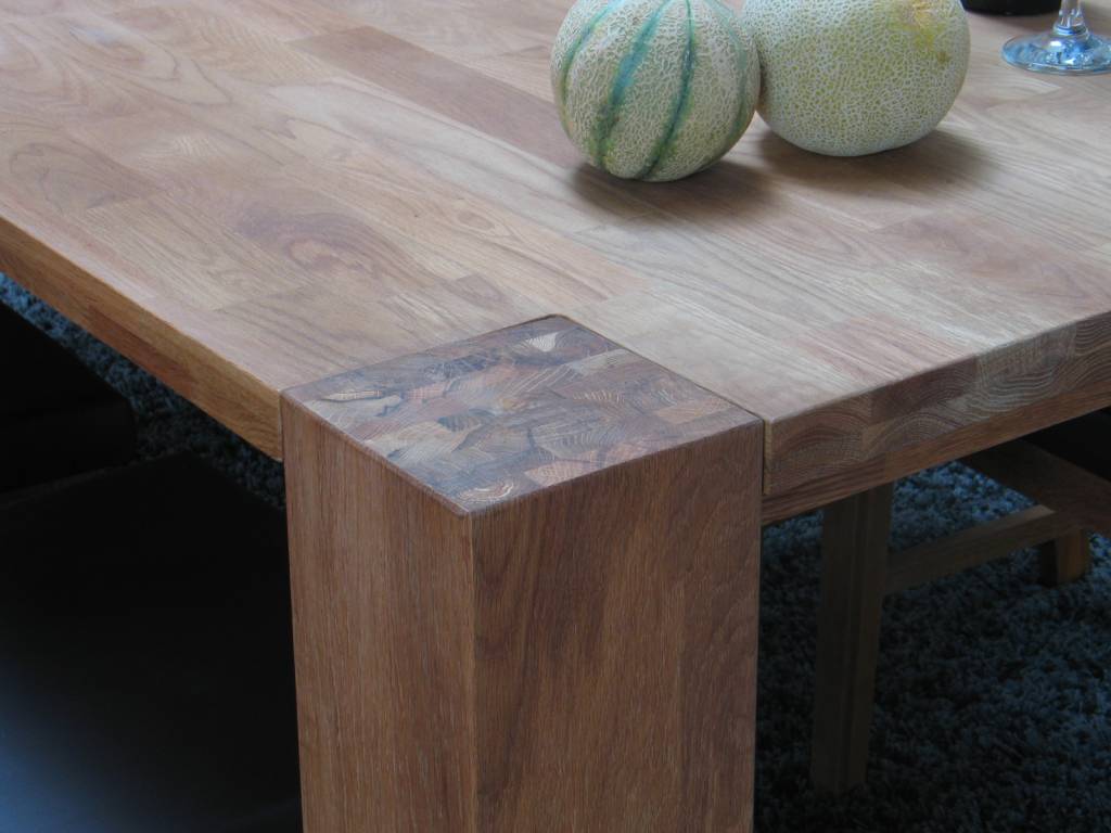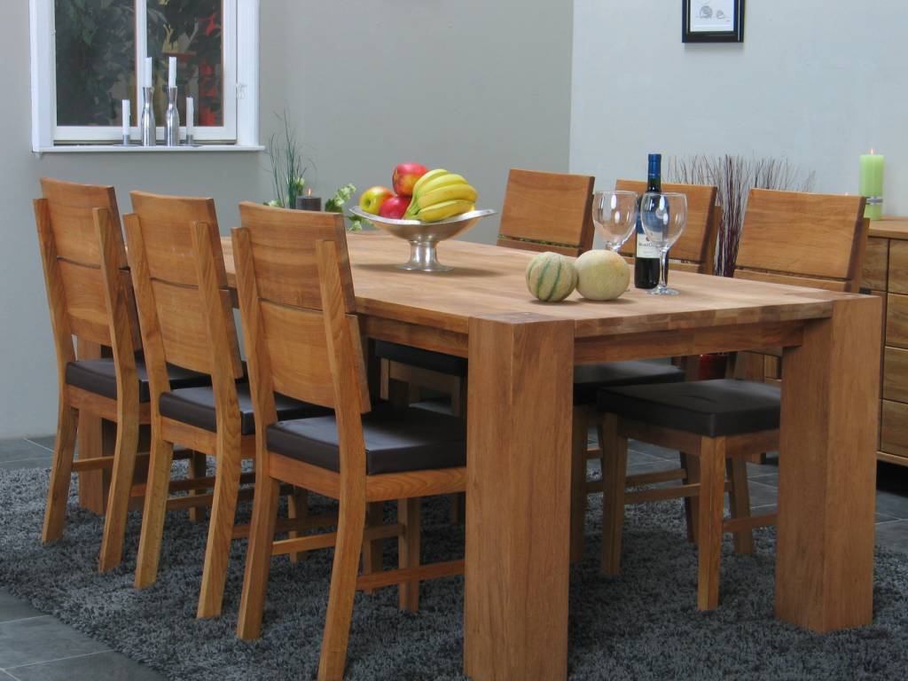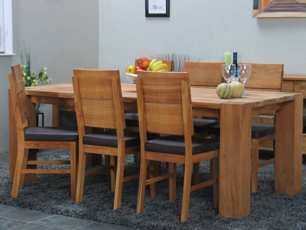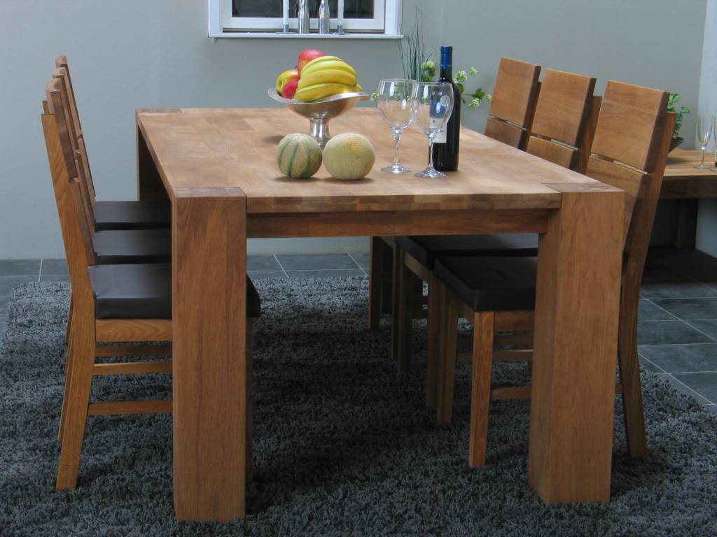Eethoek Mark, bestaande uit een massief eiken design tafel met zeer robuuste blokpoten en 6 eiken stoelen met kunstlederen bekleding. Een absoluut topmodel.