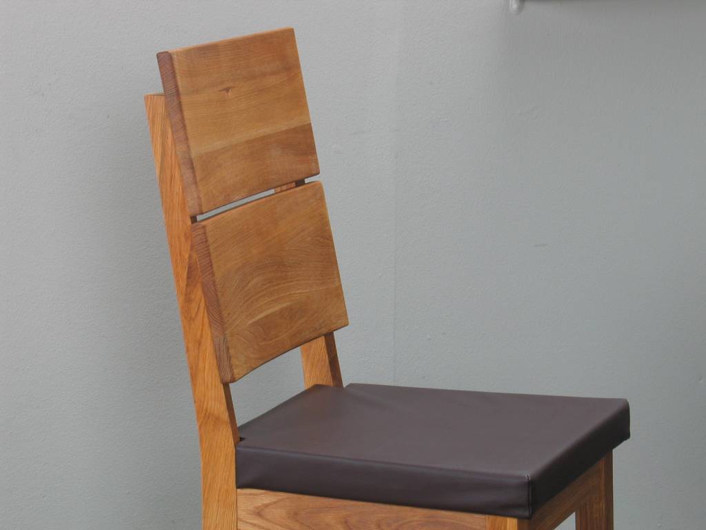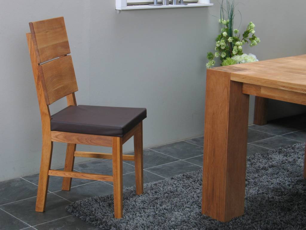- Stoelen van massief eikenhout, geölied, en bruin kunstleer