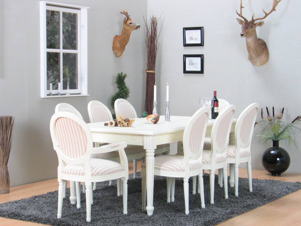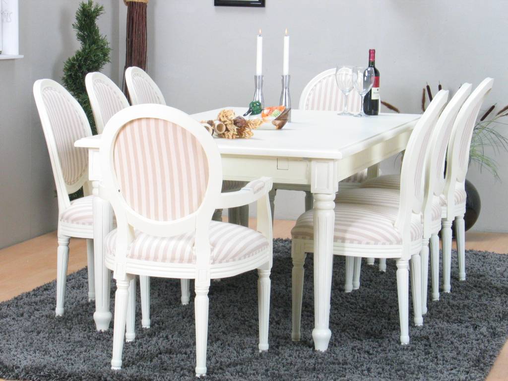 Ruime luxe eethoek wit met 8 stoelen. Compleet met eetkamertafel Mozart, 2 aansteekplaten, 6 stoelen zonder armleuning Rococo met beige stoffen bekleding en 2 matching stoelen met armleuning.