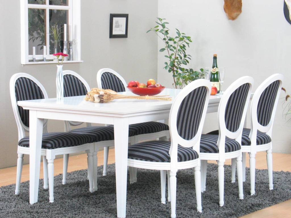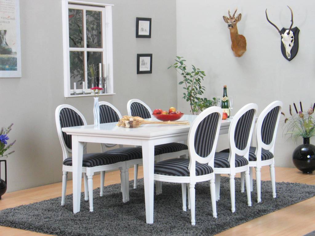 Witte eethoek Venetië, bestaande uit een eetkamertafel van 180 cm, met 2 inlegbladen te verlengen tot 276 cm, en 6 magnifieke Rococo stoelen: de perfecte mix van klassiek en modern. Bekijk de varianten en maak uw keuze!