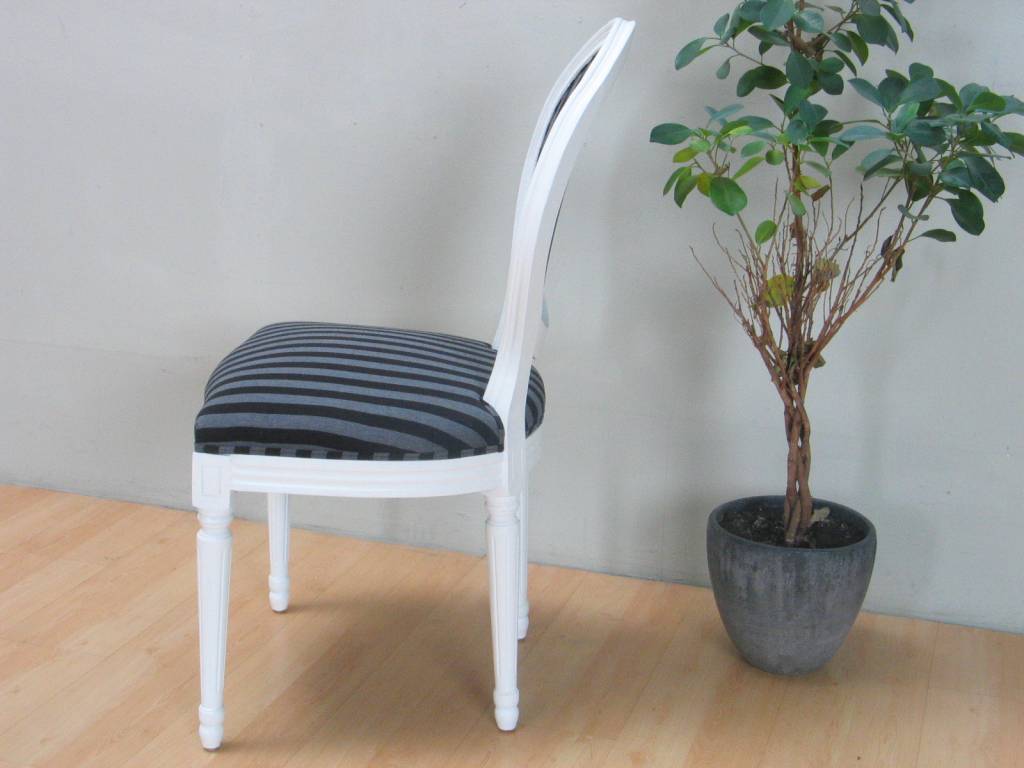 - Stoelen: massief hout, wit gelakt en zwart gestreepte bekleding van katoen