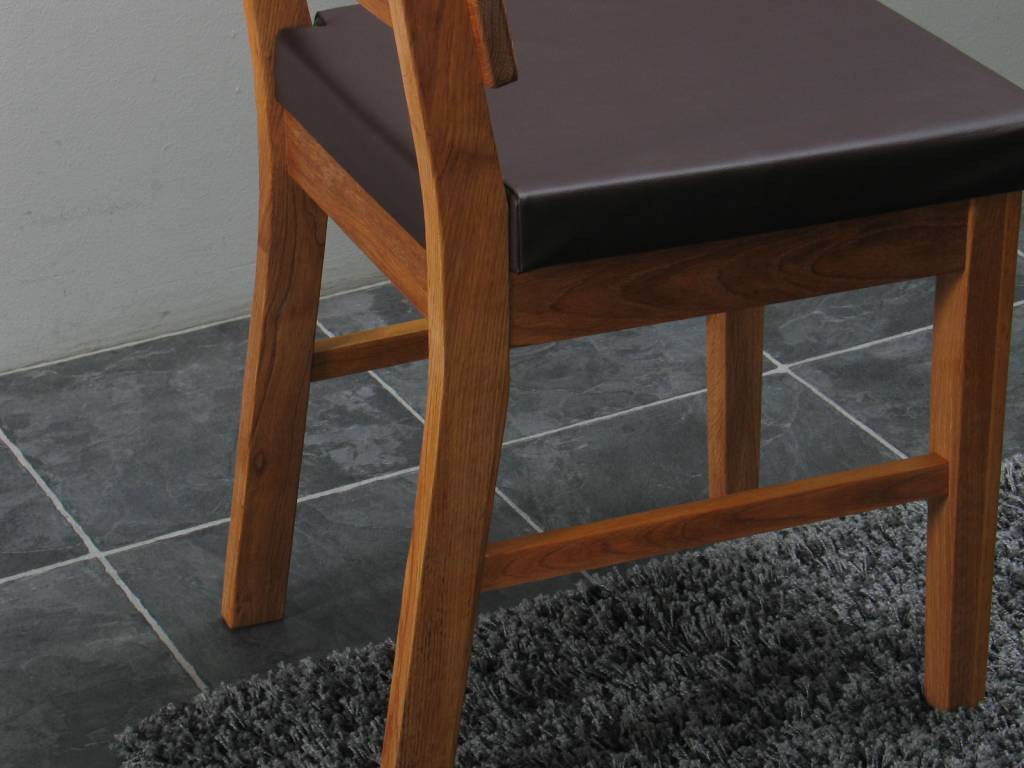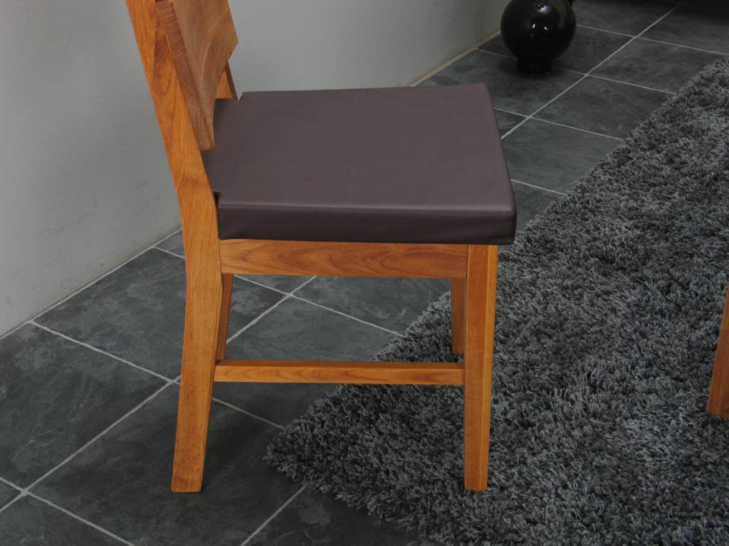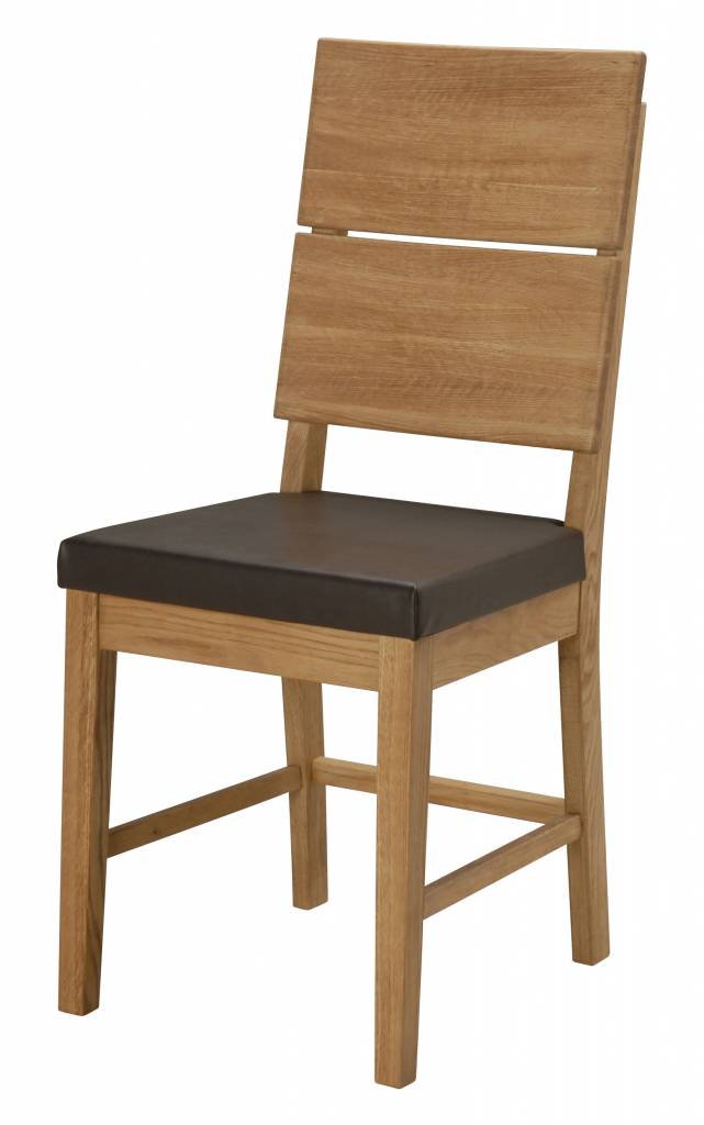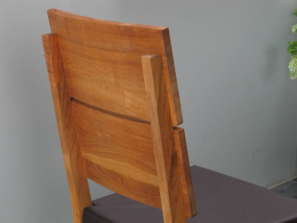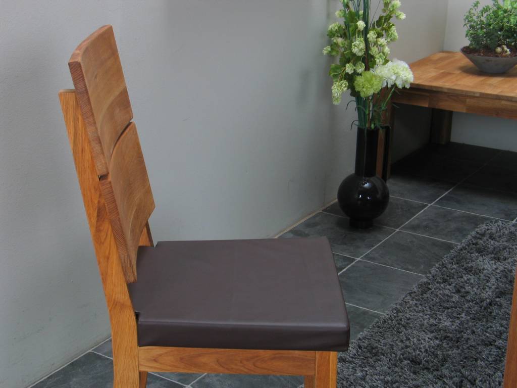 Eetkamerstoel Mark van massief eikenhout met een bruine PU-lederen (kunstleer) zitting. Past goed bij onze eettafels! Alleen in even aantallen (dus per 2) te koop, prijs is per stuk.