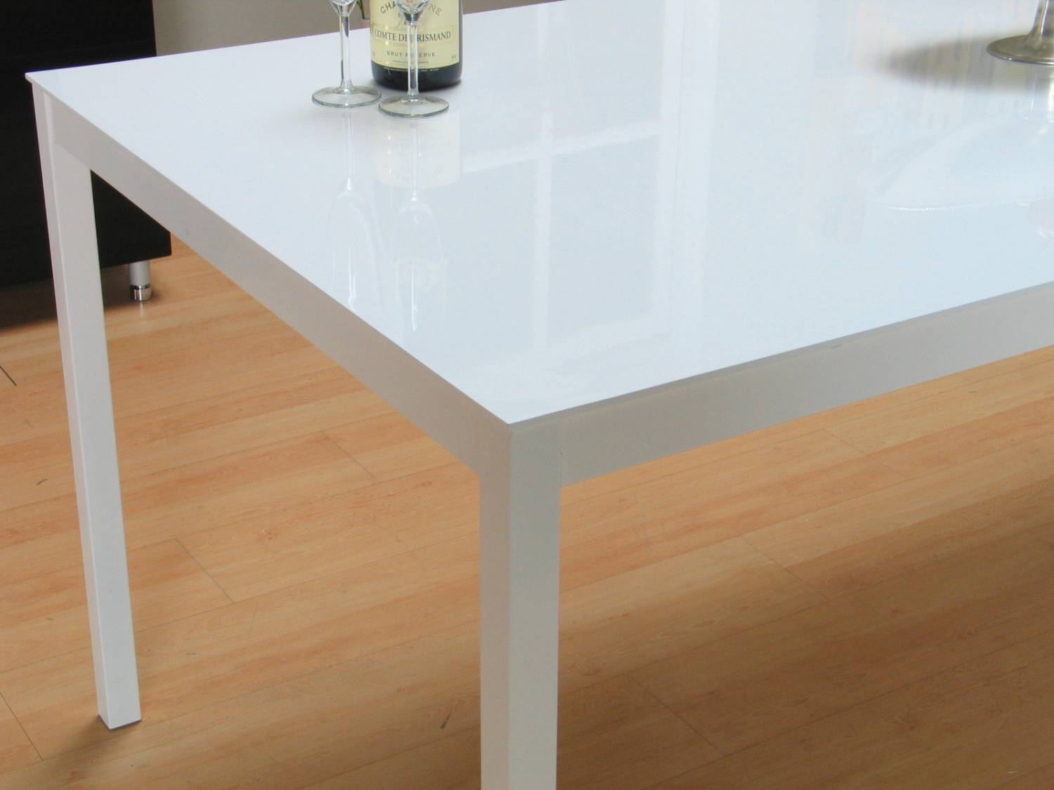 Modern wit hoogglans eetkamertafel, ook populair als kantinetafel of vergadertafel. Egaal wit gelakt tafelblad en metalen onderstel in dezelfde kleurstelling.