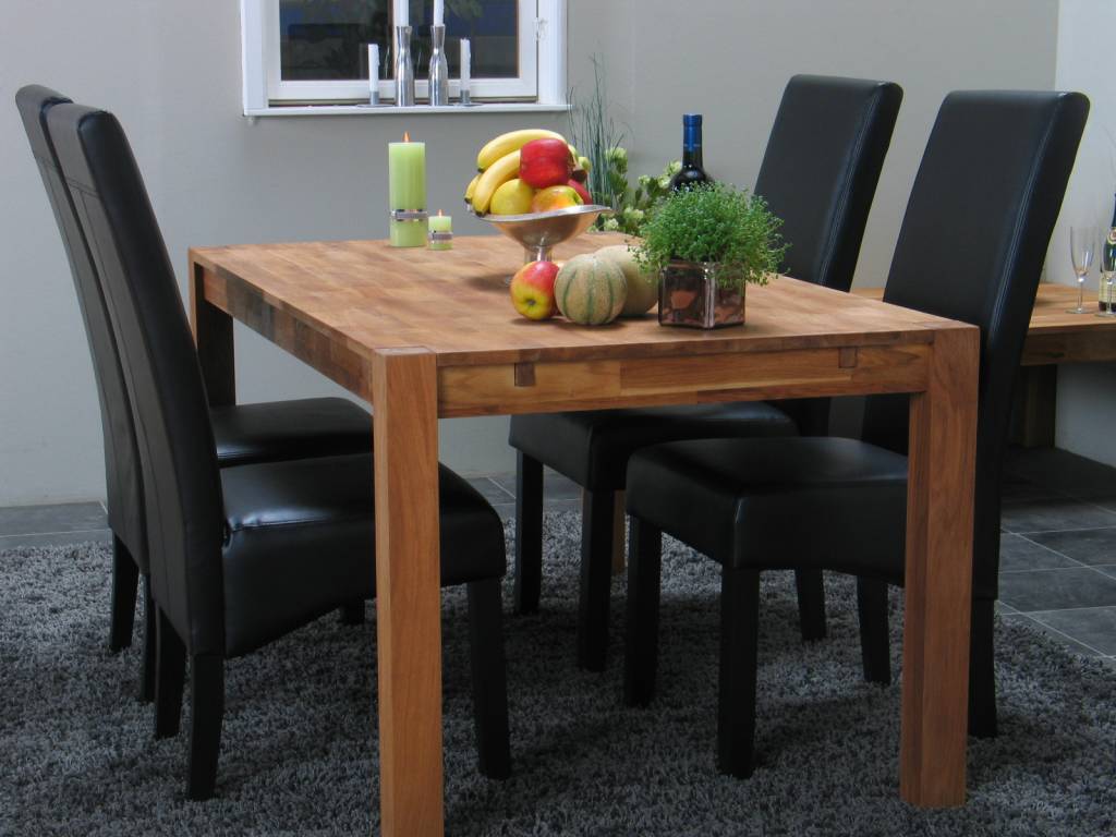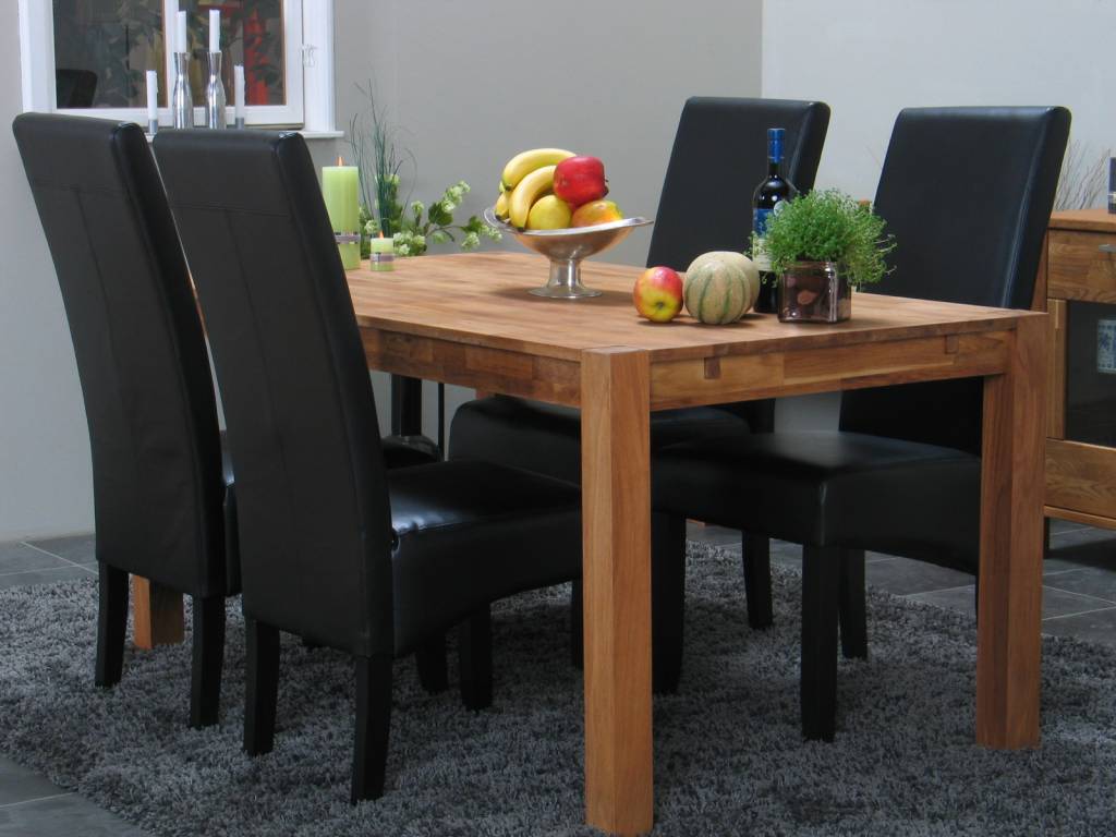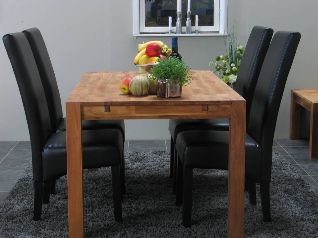 Robuuste eettafel van 140 bij 90 cm gemaakt van massief eikenhout en 4 stoelen met zwart kunstlederen bekleding. Een complete en mooie set voor een scherpe prijs!
