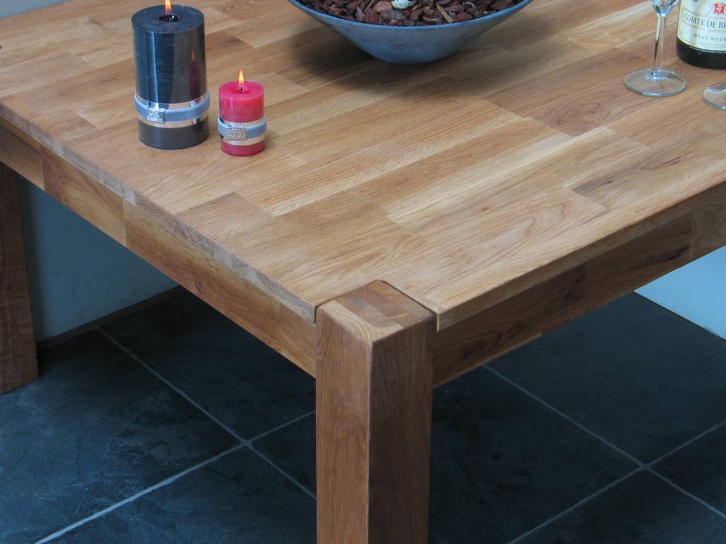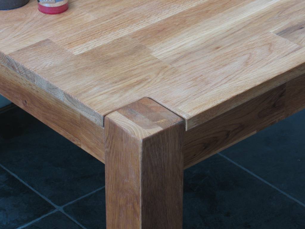De tafelpoten zijn 7,5 bij 7,5 cm dik.