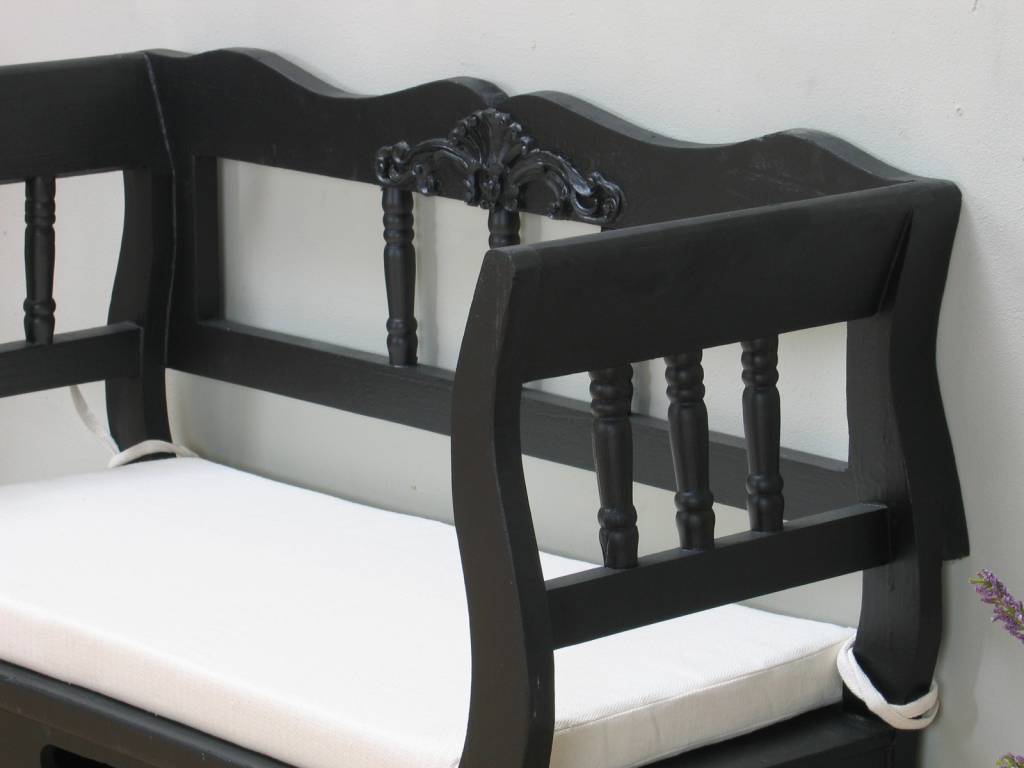 Massief houten halbankje van 90 cm breed, zwart gelakt. Het bankje heeft een lade en wordt geleverd met kussen.