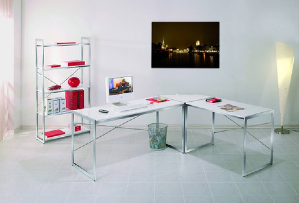 Nieuw van Hioshop: hoekbureau, bestaande uit 2 losse bureaus en een hoekdeel, dus op te stellen zoals u zelf wilt! Wit hoogglans gelakt MDF met een verchroomd onderstel.