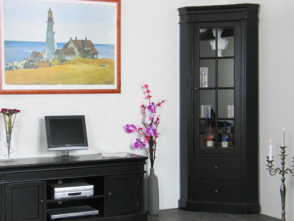 Antiek gepatineerde hoekvitrine van massief hout, donker gelakt. Past goed samen bij de andere meubelen uit de serie Mozart waaronder het TV meubel en een buffetkast! Wordt opgebouwd geleverd!