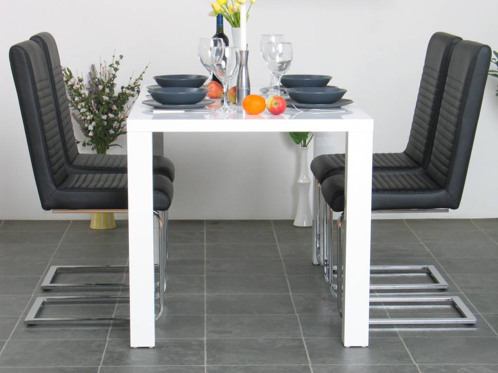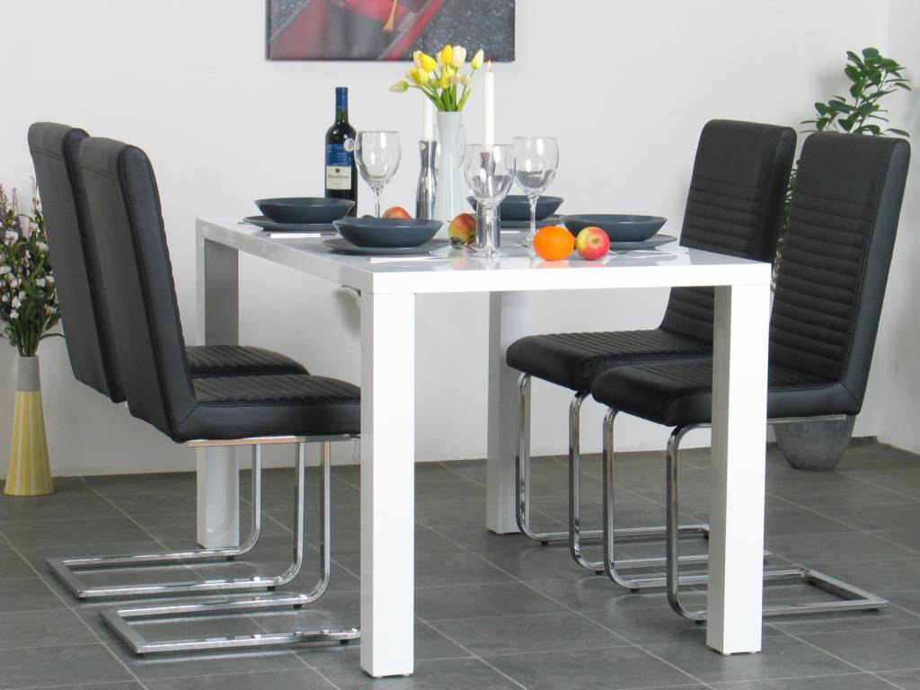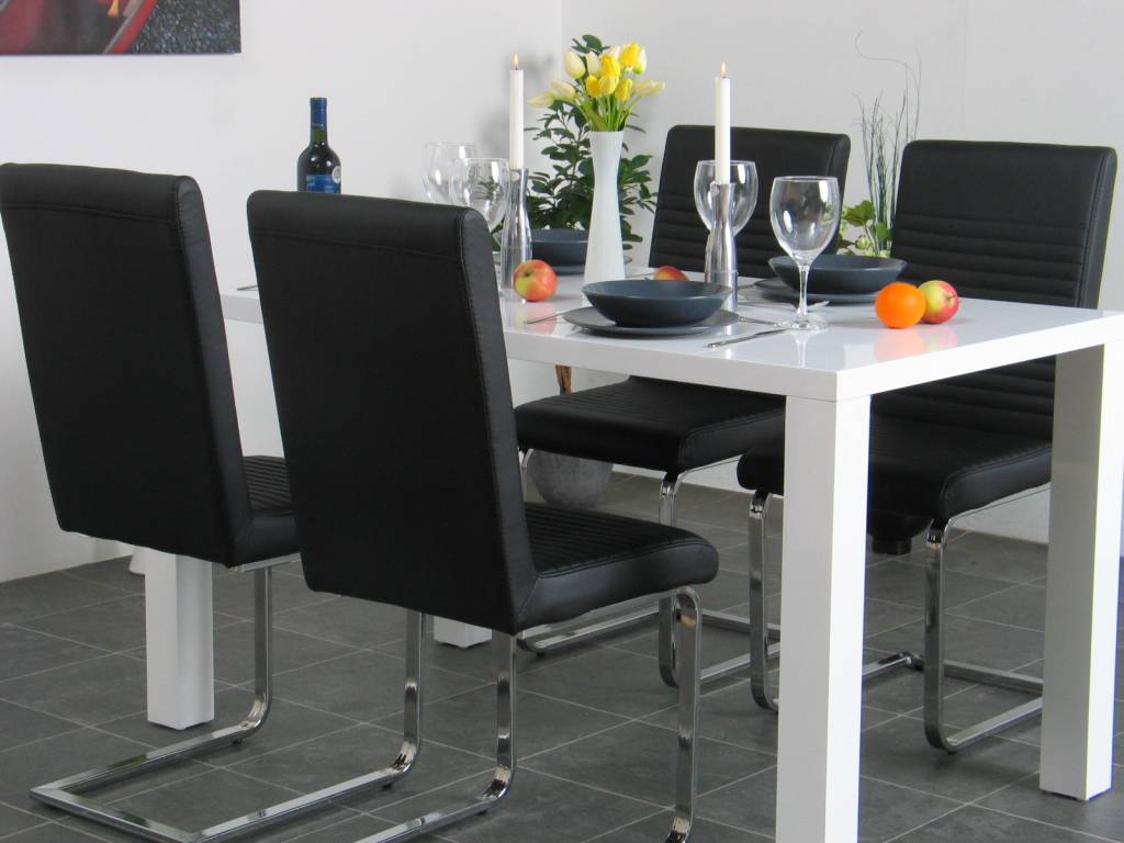 Set bestaat uit een wit gelakte tafel inclusief 4 zwarte comfortabele stoelen met stevig verchroomd onderstel. De tafel is ook goed te gebruiken op kantoor, bijvoorbeeld als vergadertafel.