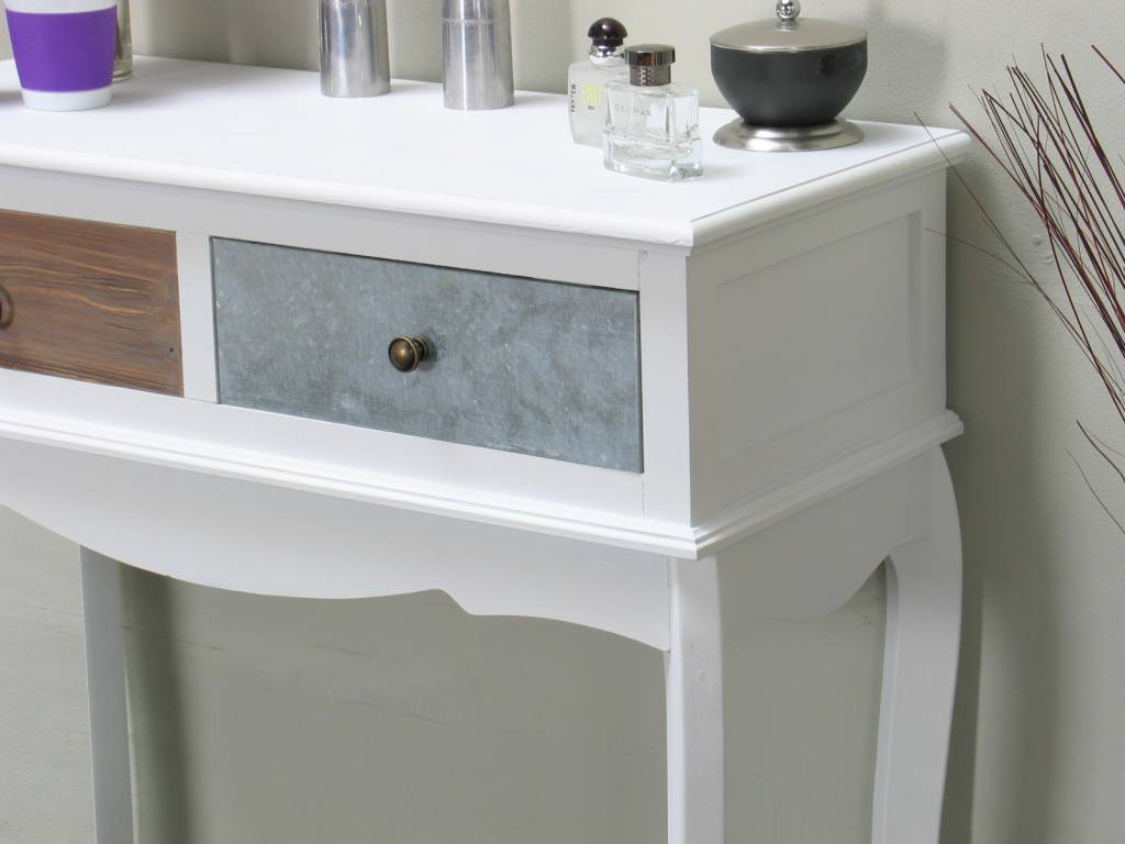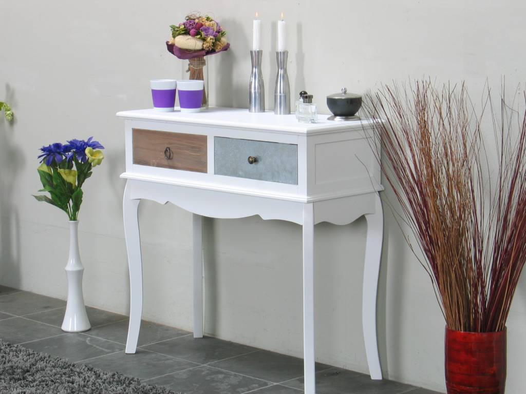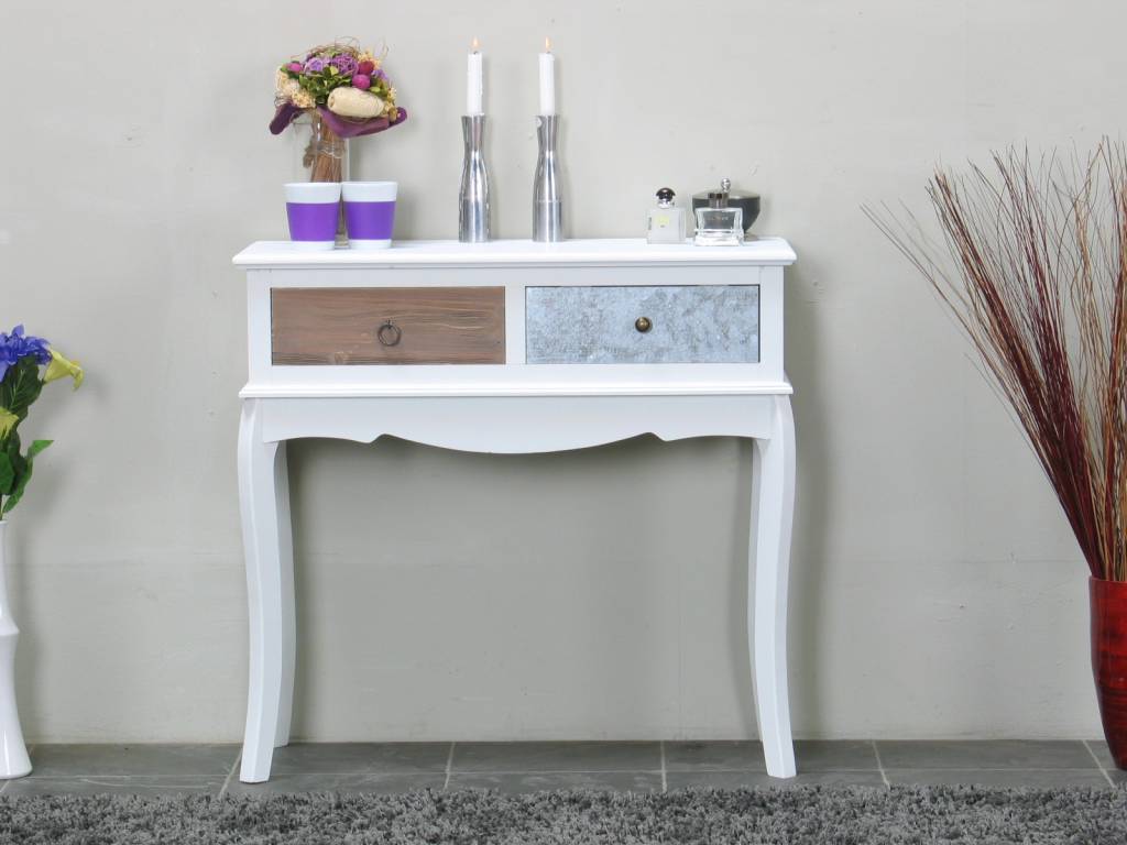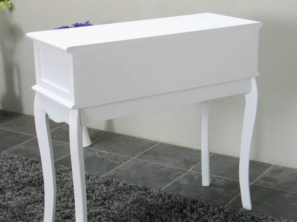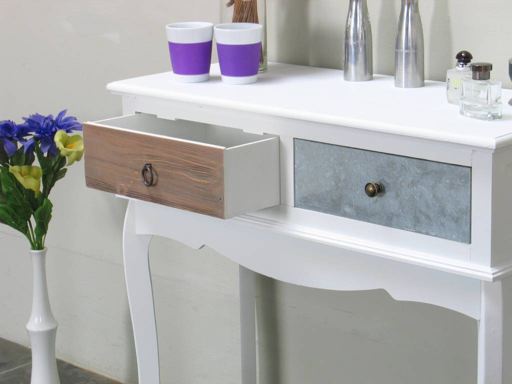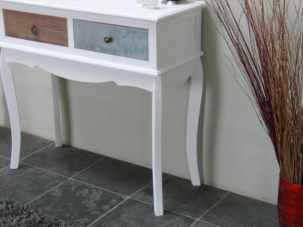 Antiek gepatineerde kaptafel van wit geverfd en gelakt paulowniahout. Het meubel heeft twee lades van MDF waarvan er een met metaal bedekt is. Dit stijlvolle tafeltje past in iedere huiskamer!