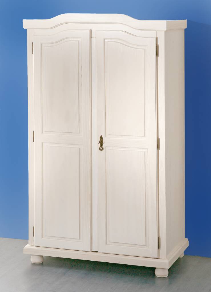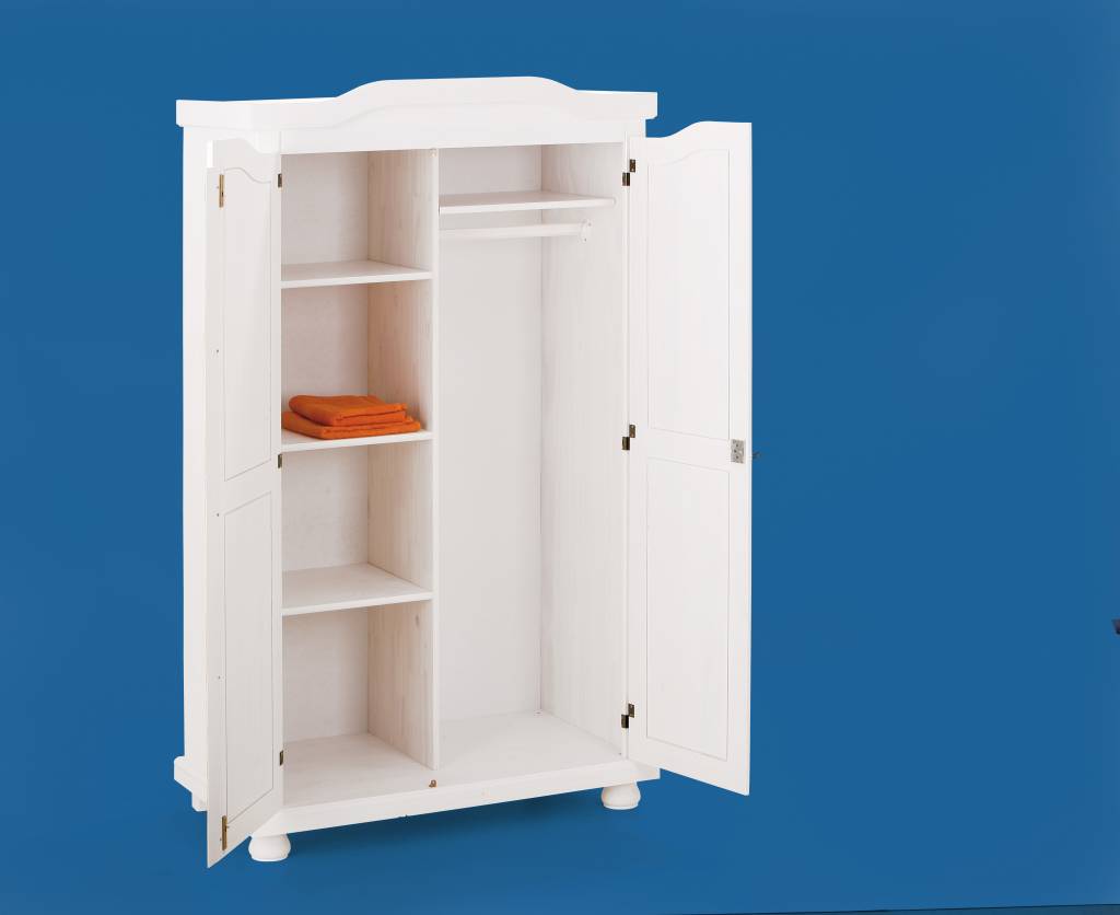 Massieve witte grenen tweedeurs kledingkast met mooie handgrepen. De kledingkast Hedda past zeer goed bij de wit gelakte tienerbedden uit ons assortiment eenpersoonsbedden.