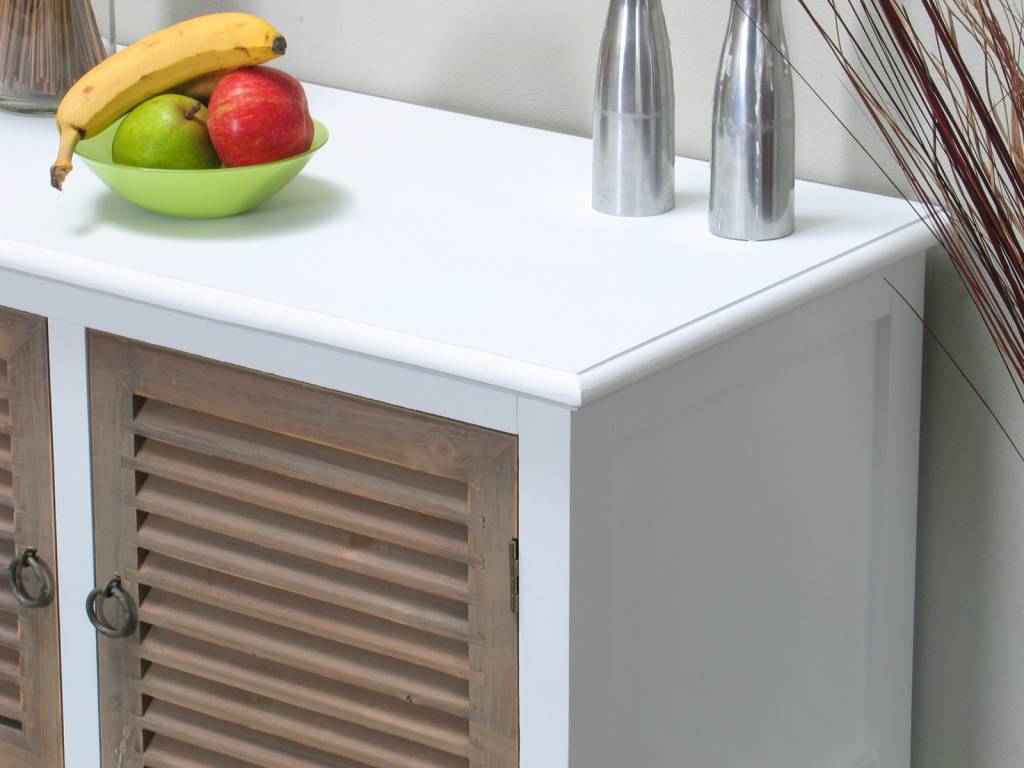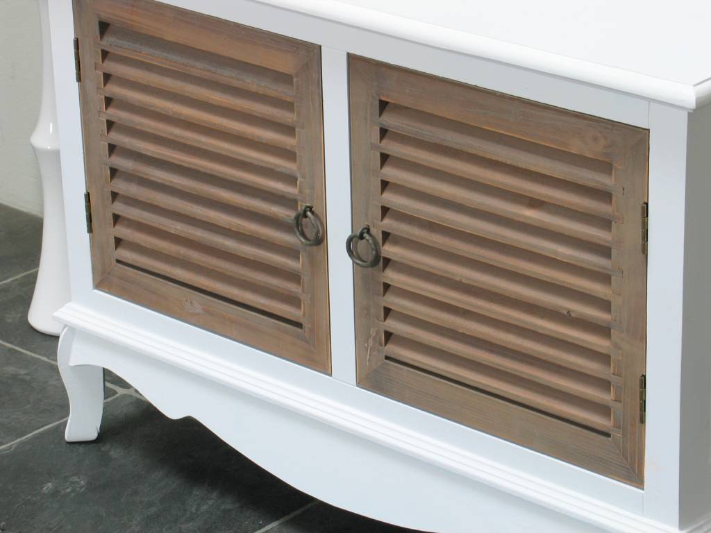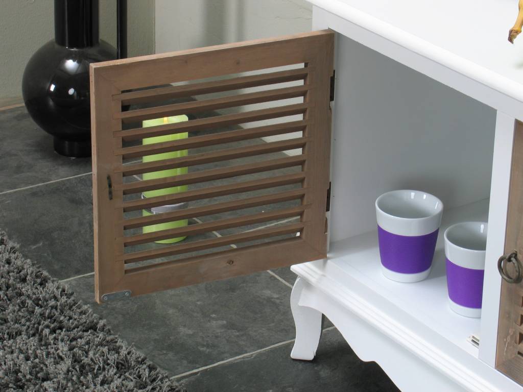 Laag dressoir met 2 deuren, gemaakt van wit geverfd en gelakt paulowniahout. Past goed bij de overige meubelen uit dezelfde serie. Dit meubel wordt compleet opgebouwd geleverd en is dus geen zelfbouwpakket!