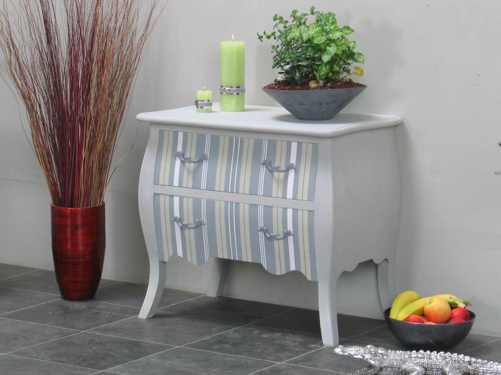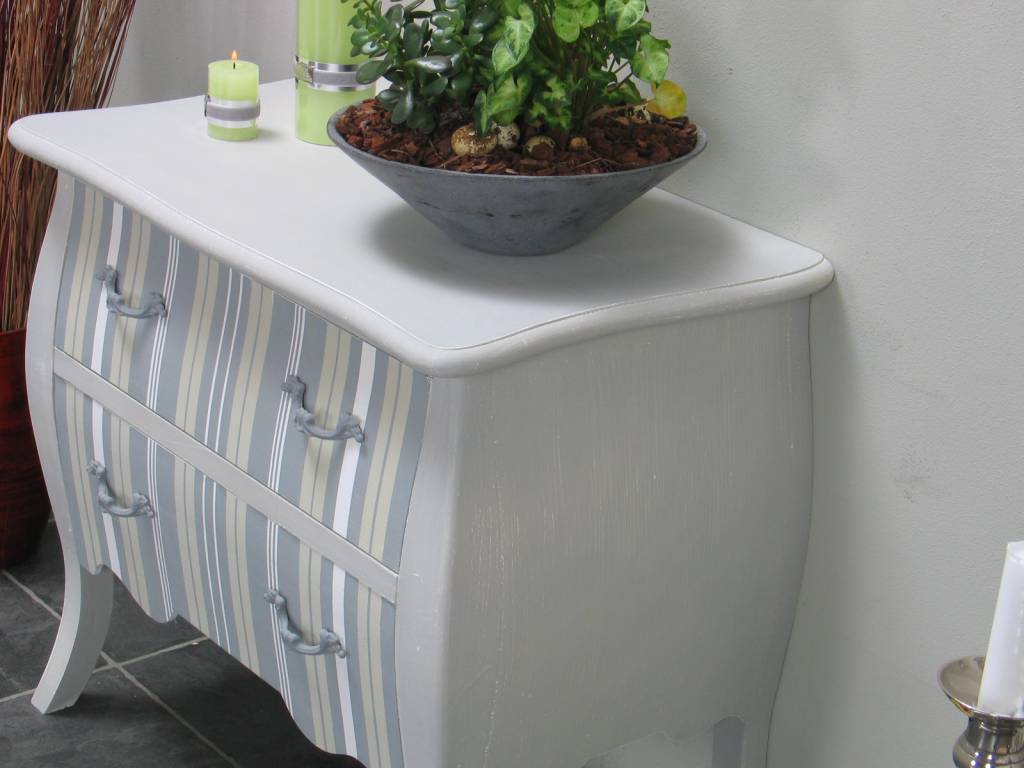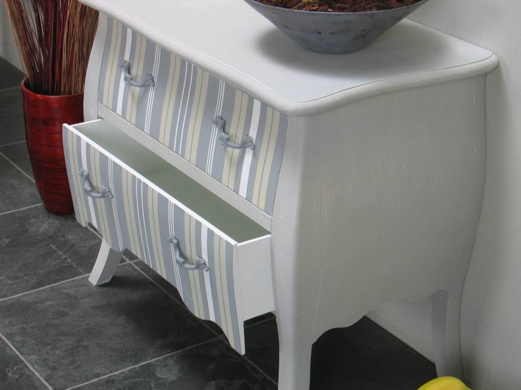 Antiek ogende ladekast van massief hout en MDF met 2 lades, decoratief geverfd en gelakt! Past goed bij de overige meubelen uit dezelfde serie. Wordt opgebouwd geleverd!