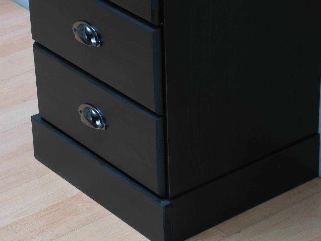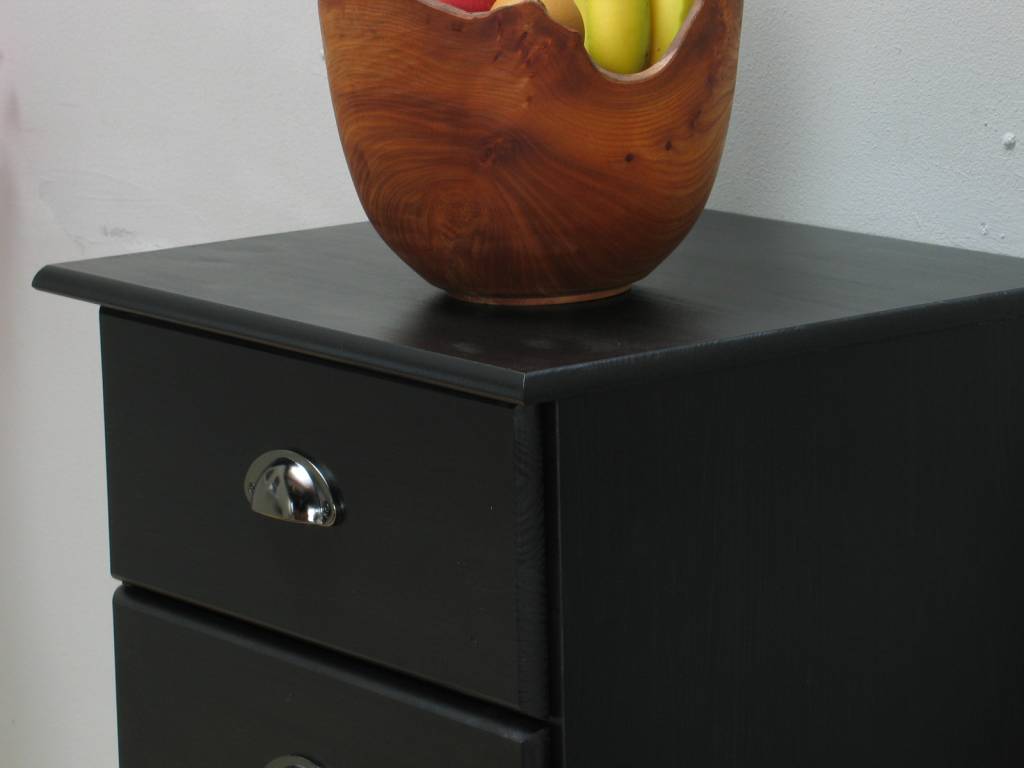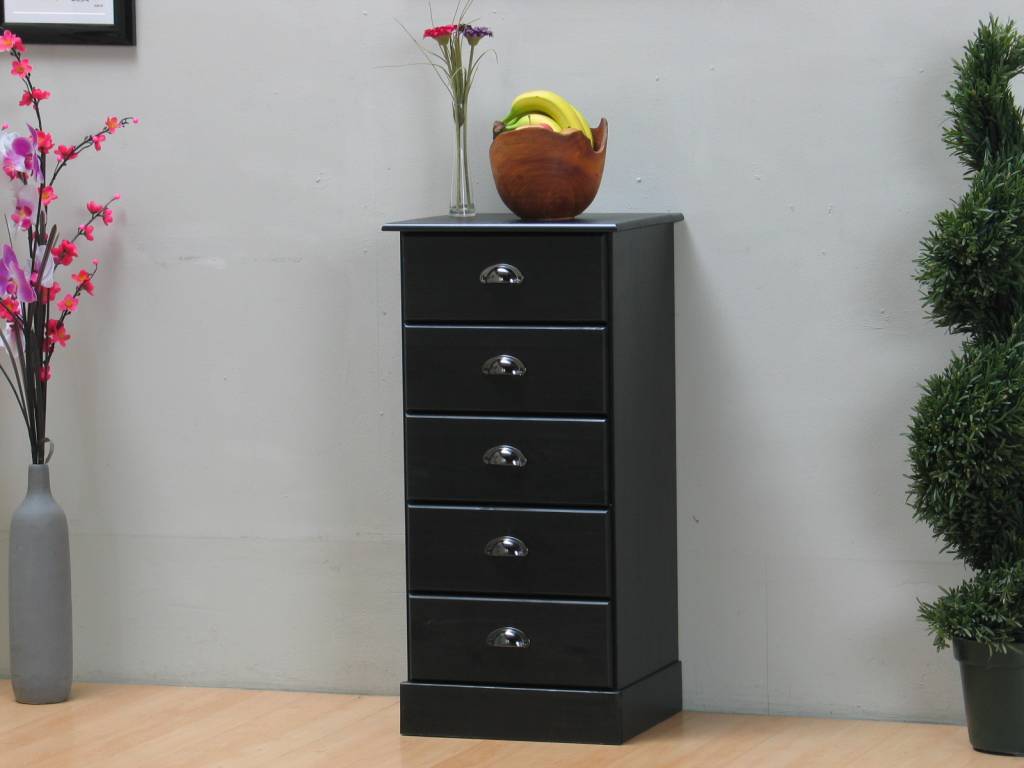 Donker zwart ladekastje Terra, een ladekastje met 5 lades in zwart grenen, dus de houtnerf is nog licht zichtbaar. Dit in combinatie met de leuke handgrepen maakt deze ladekast tot een markant meubelstuk, ondanks de kleine omvang en prijs!