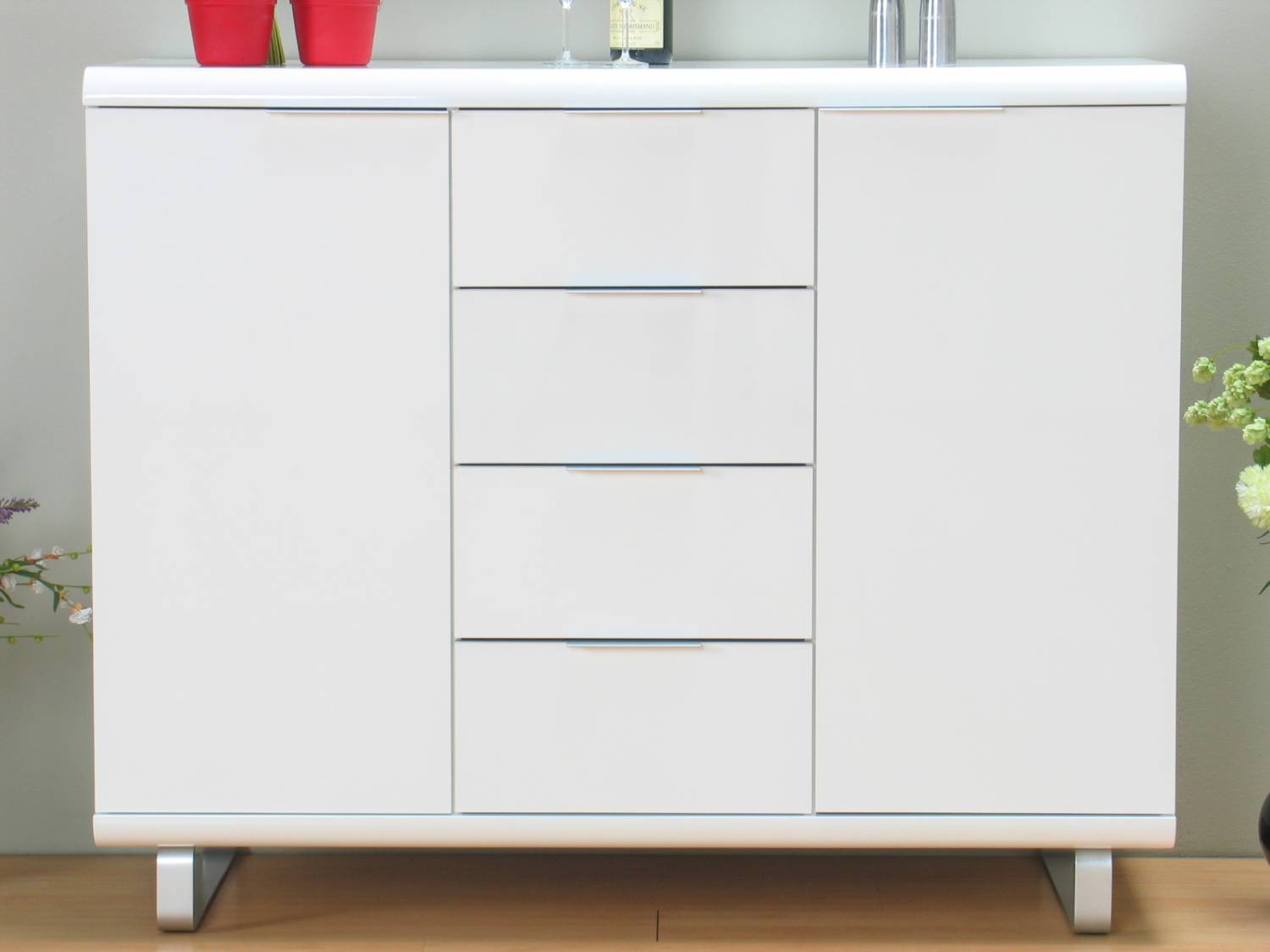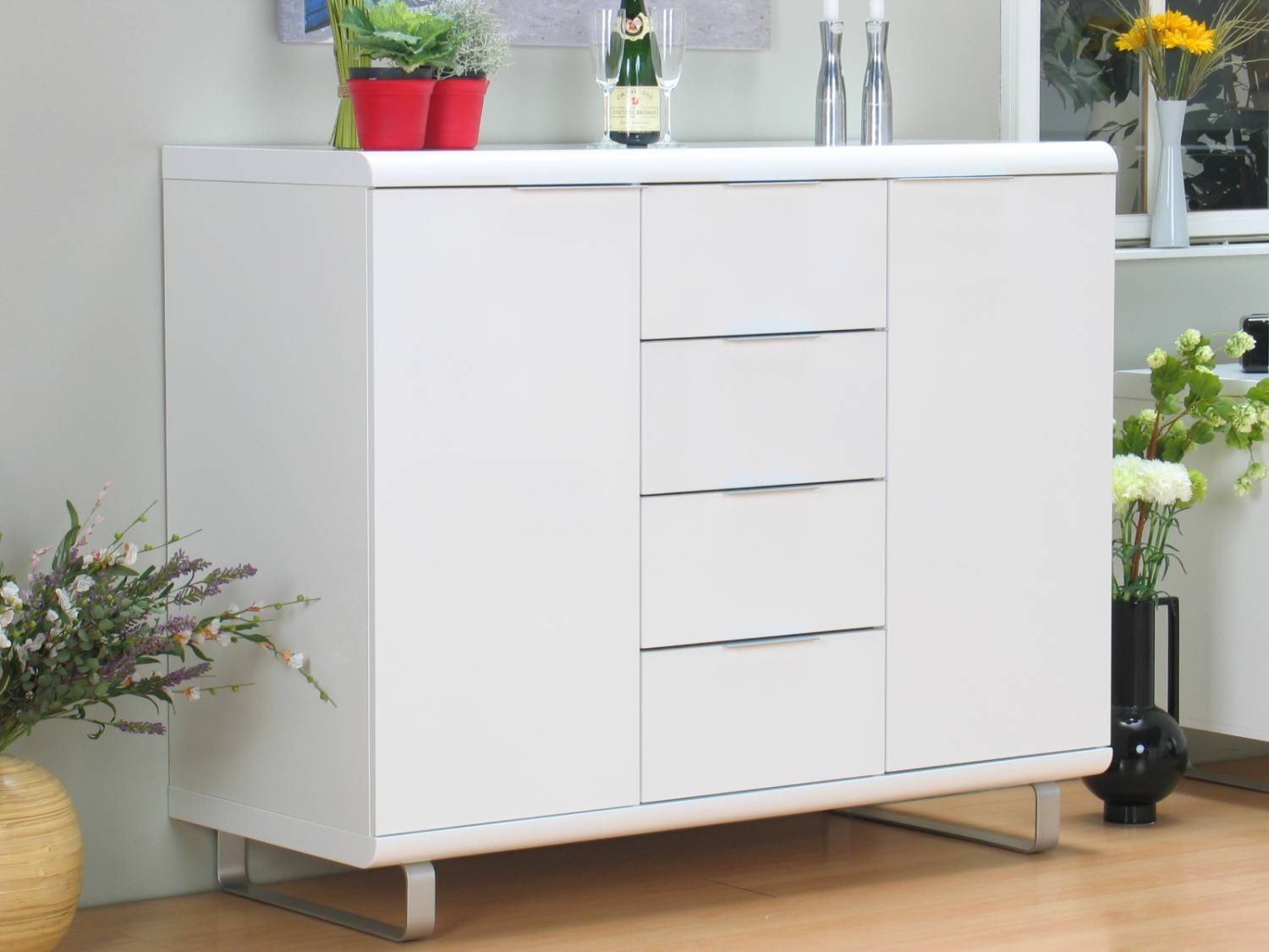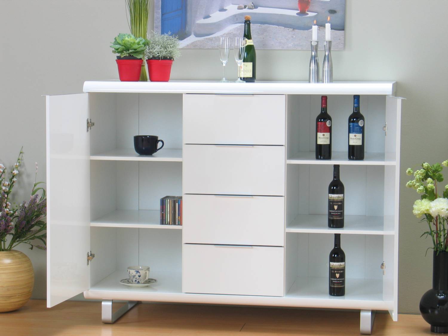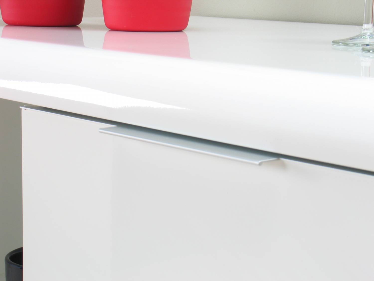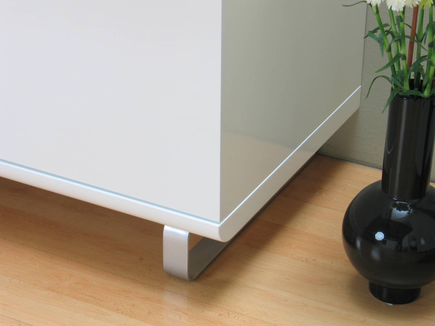 Witte hoge wandkast Milan met nette hoogglans afwerking. Ook het metalen 'beugel' onderstel is van zware kwaliteit waardoor het geheel er verzorgd uit ziet. Ook verkrijgbaar in zwart en rood.