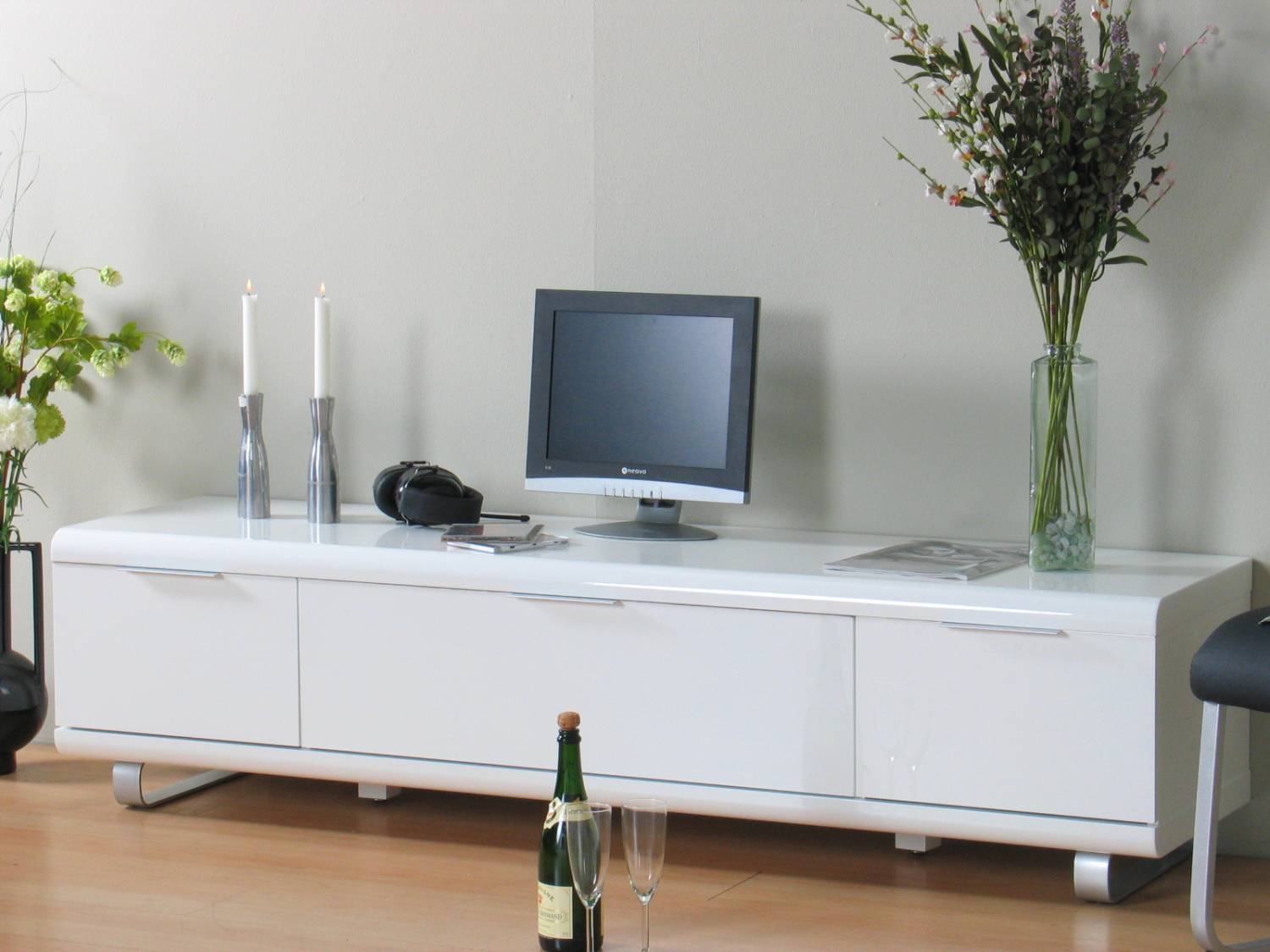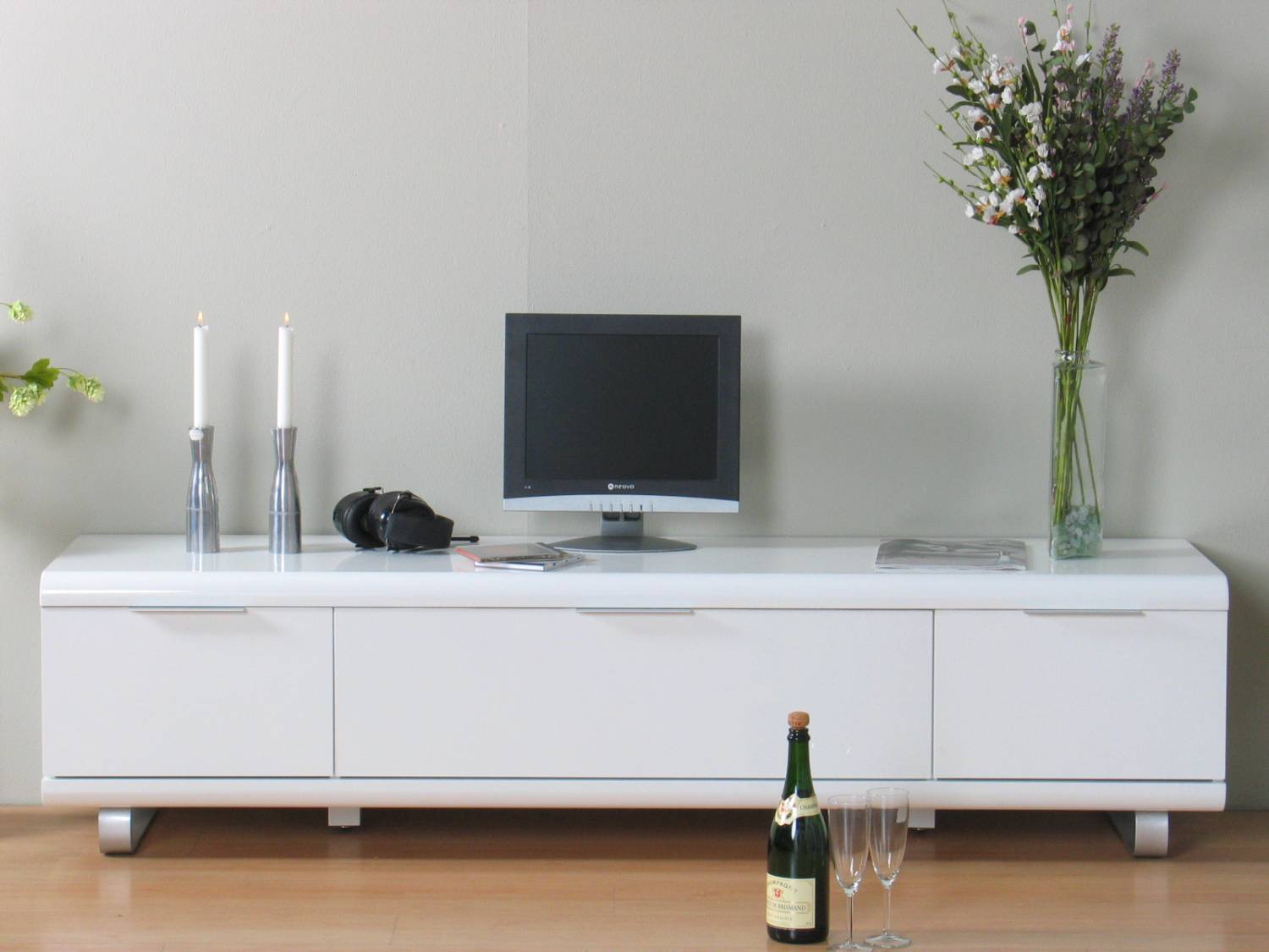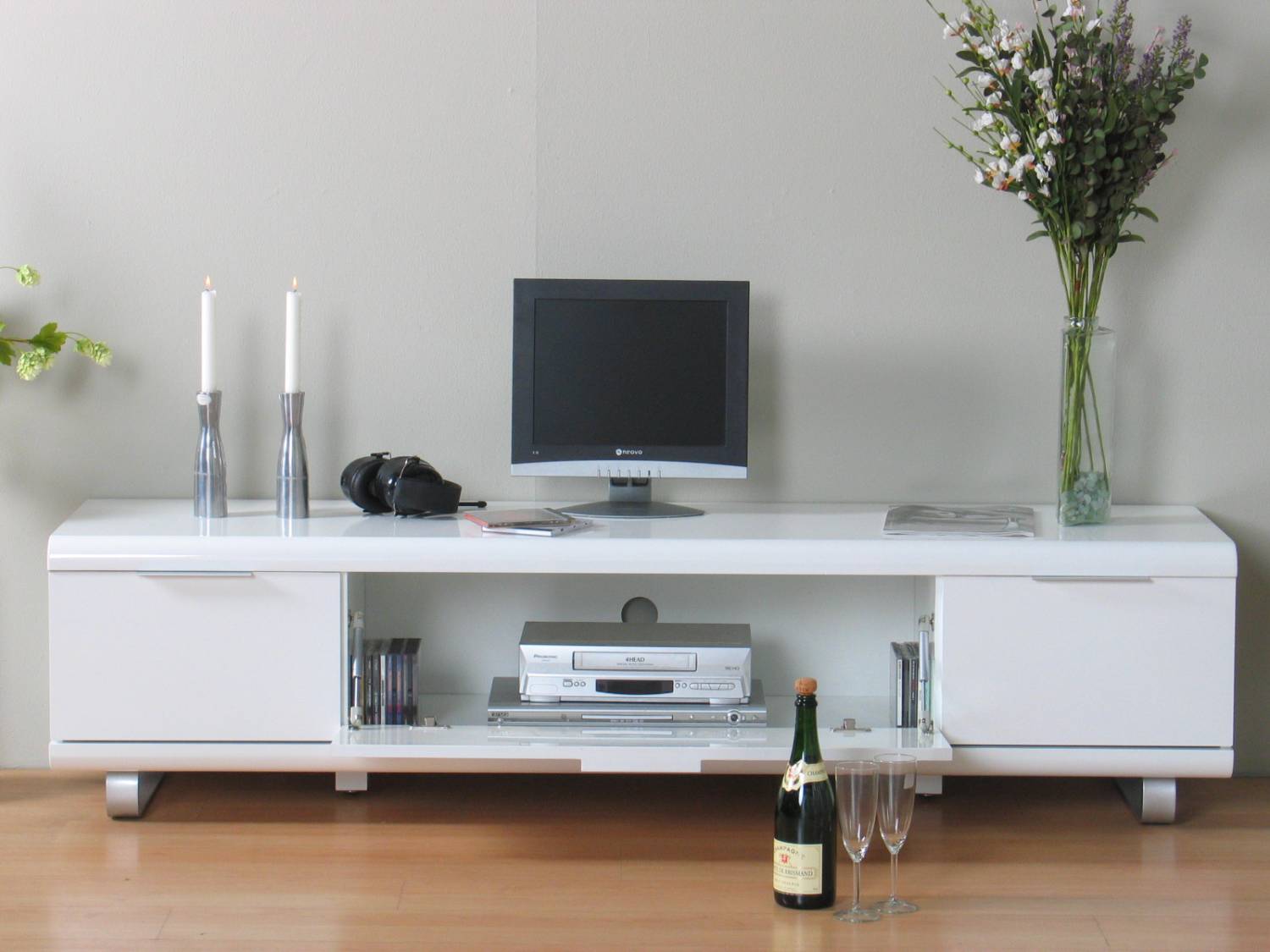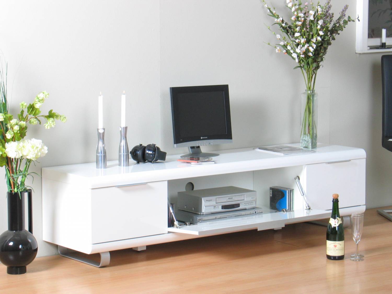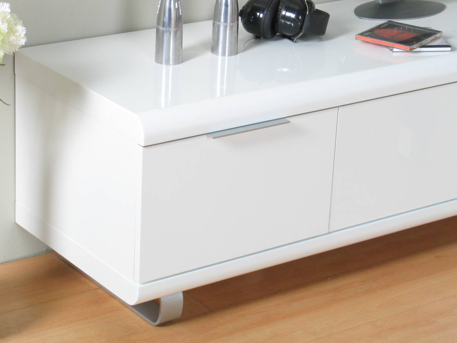 Wit hoogglans design, functioneel, 180 cm breed en met 2 laden en een klep voor het plaatsen van bijvoorbeeld een digitale ontvanger of dvd-speler. Ook verkrijgbaar in zwart. Elders voor €505,-: pak mee dat voordeel bij hioshop!