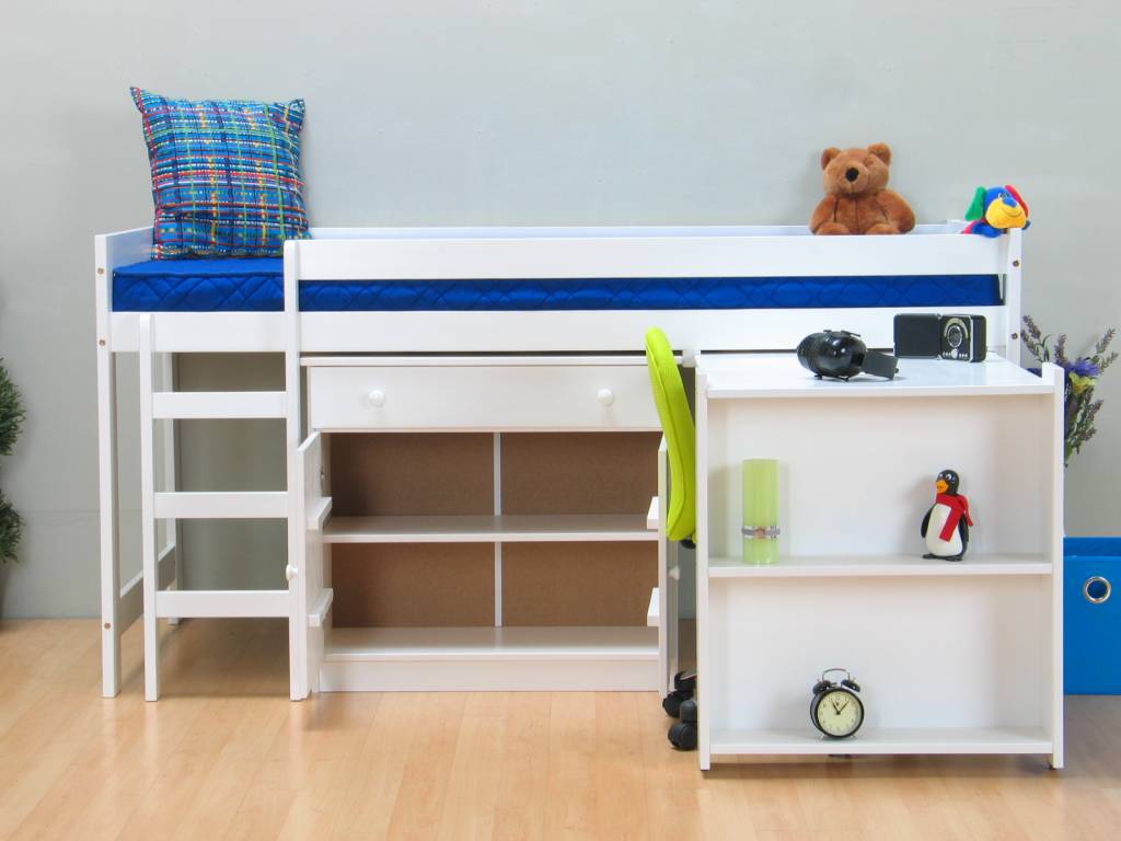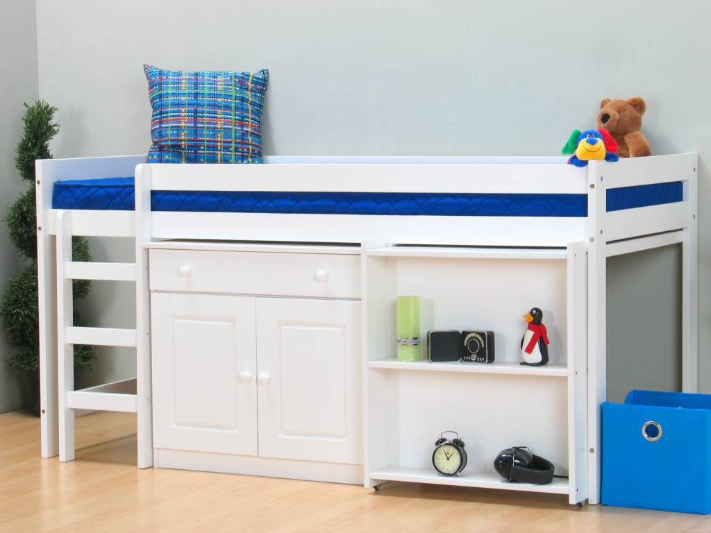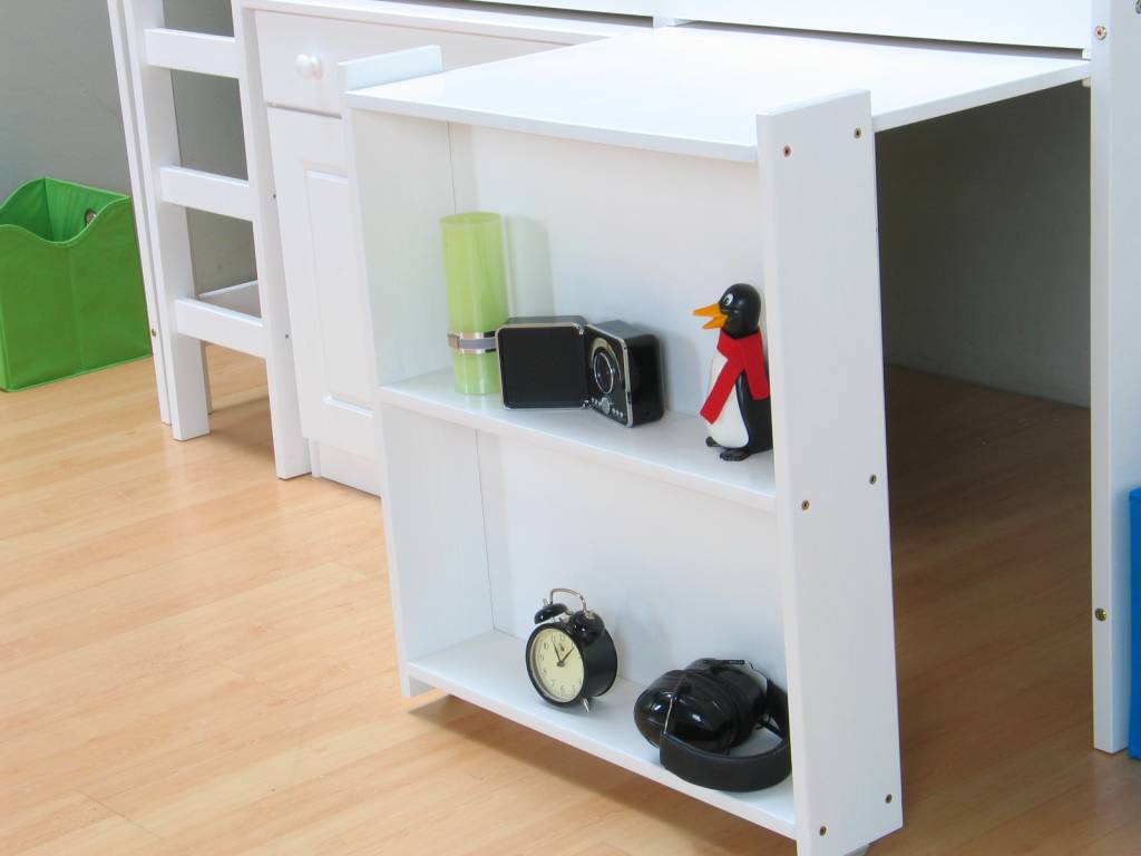 Halfhoogslaper Nemo wit, compleet met bureaublad, open kast, kommode en lattenbodem! Ideale ruimtebesparende halfhoogslaper, handig voor in de kinderkamer!