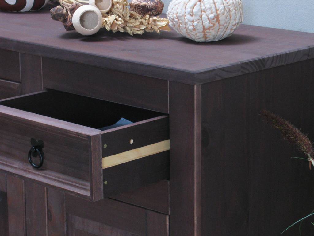 Handig dressoir voor in de kleine ruimtes, wordt ook veel gebruikt als TV kast. Gemaakt van bruin afgewerkt massief hout, alles in Mexicaans grenen stijl uitgevoerd.