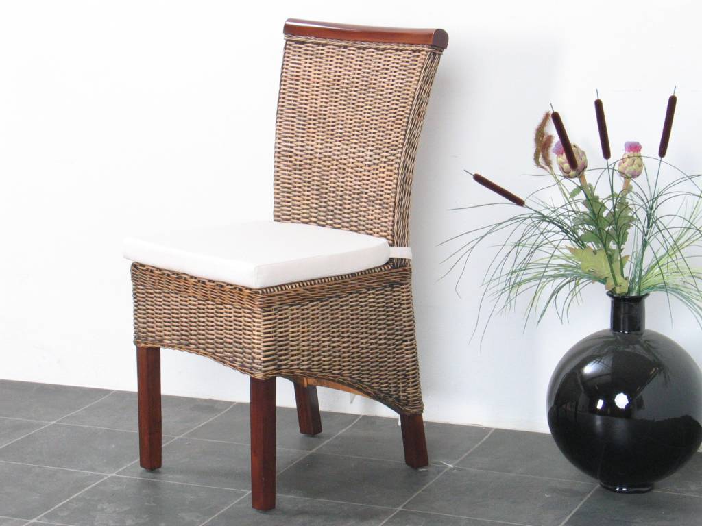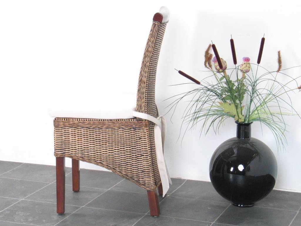 Rotan stoel met kussen, gemaakt van bruin massief hout en gevlochten rotan in brown wash. De rotan stoel Larissa is er ook in het wit. Leuk in combinatie met een van onze eettafels. Wordt opgebouwd geleverd!
