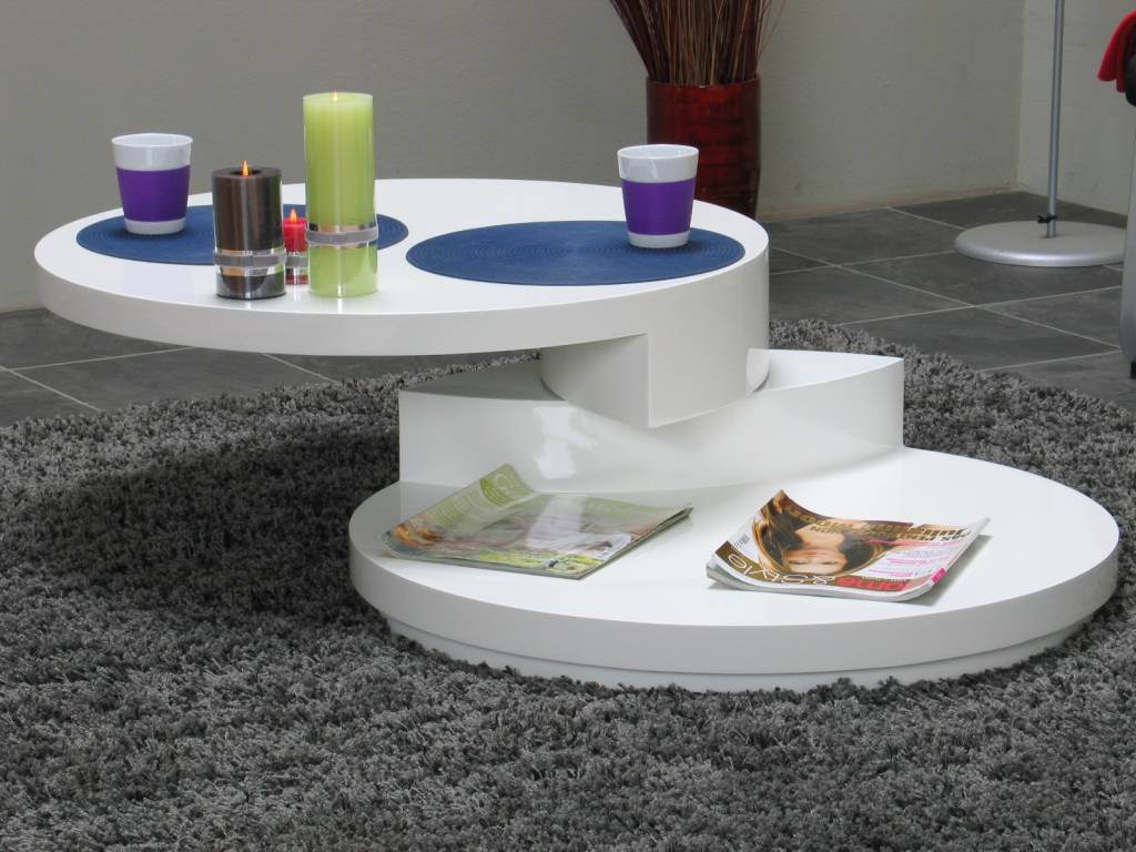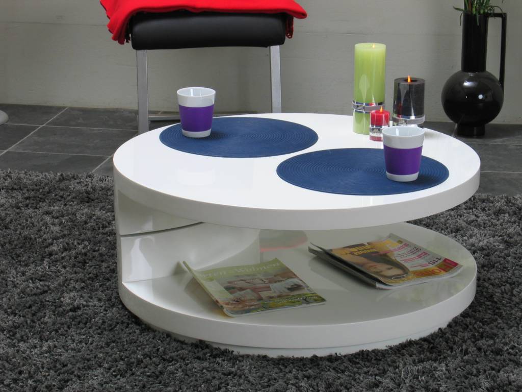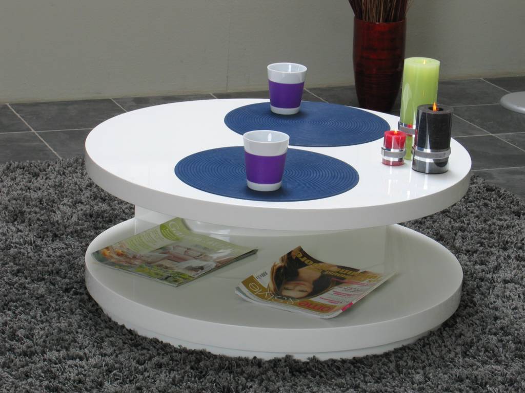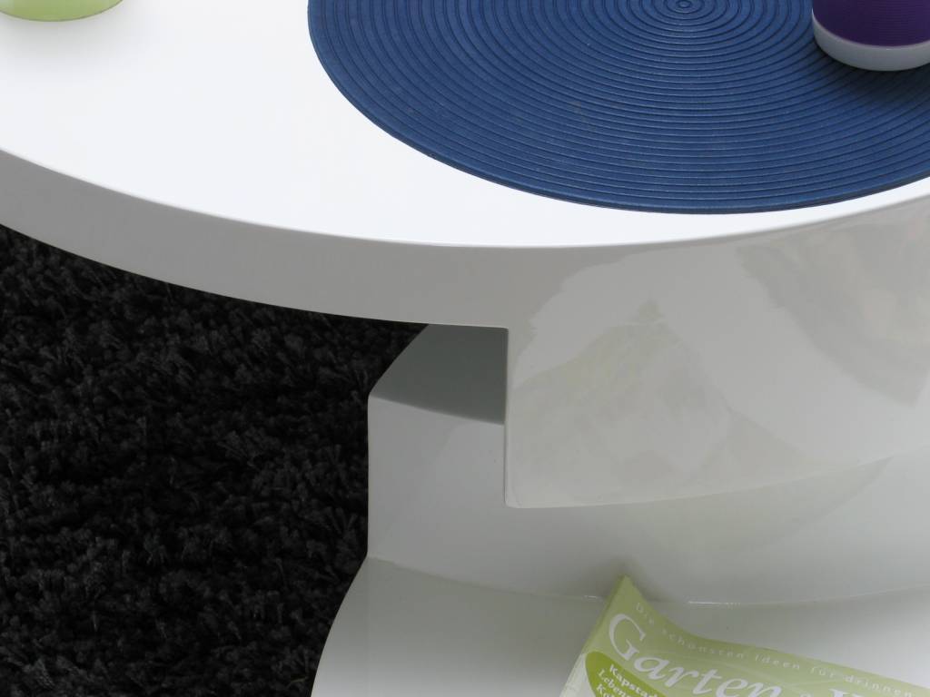 Ronde salontafel in wit hoogglans, met een 360 graden draaibaar tafelblad. Praktisch design dus!