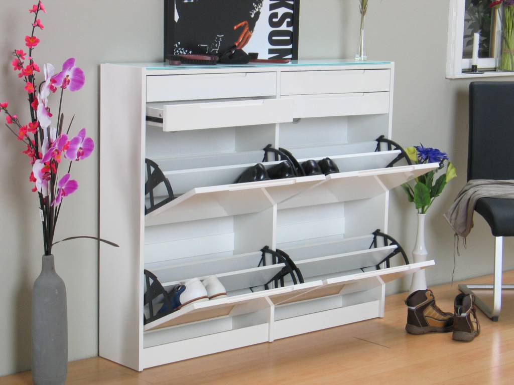 4 lades, 4 kleppen met ruimte voor tenminste 16 tot 20 paar schoenen