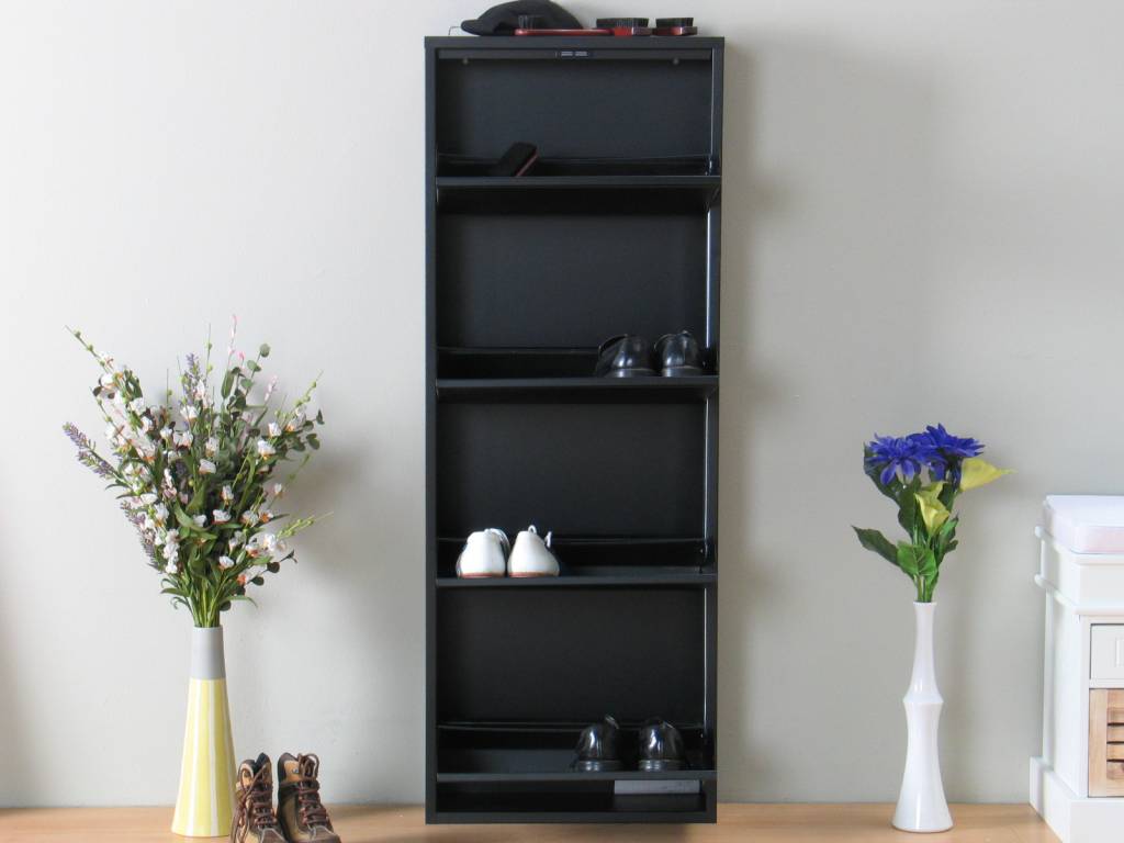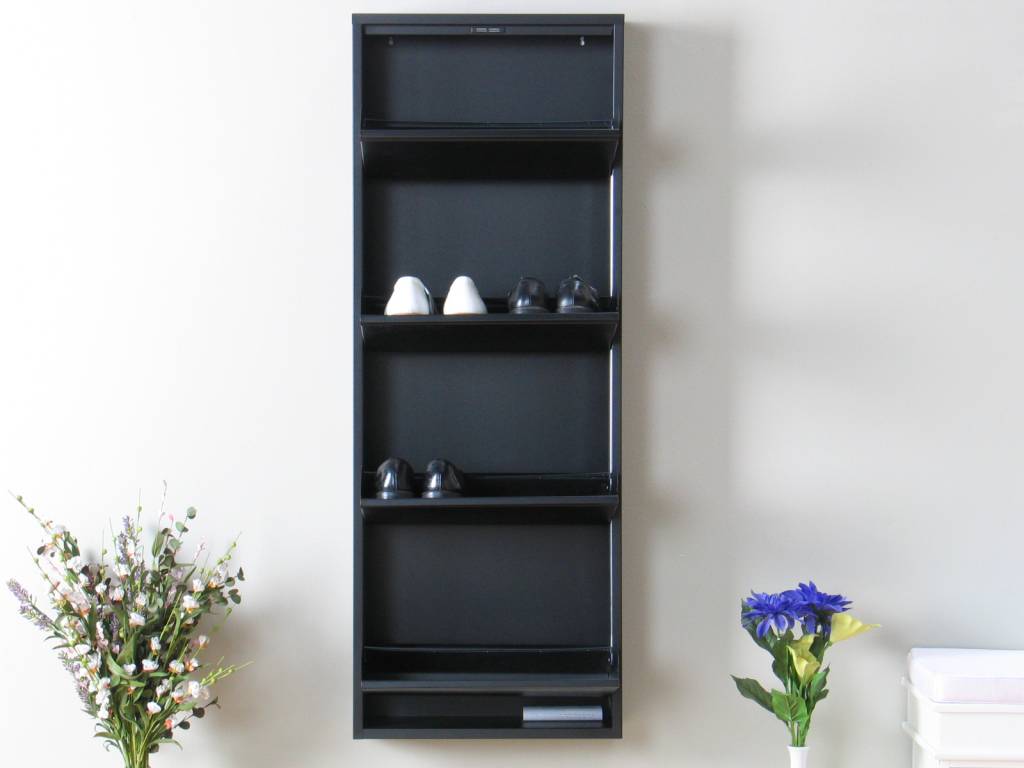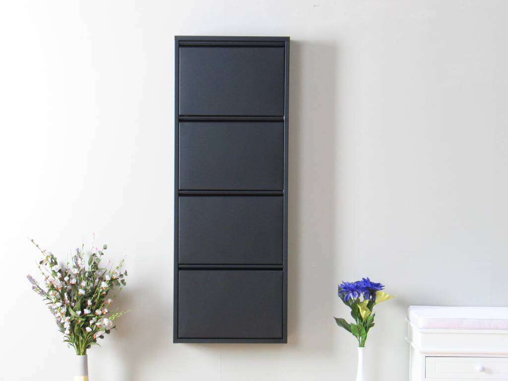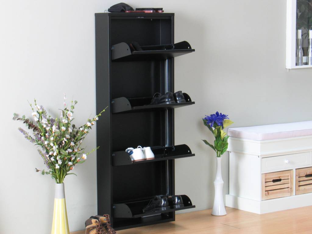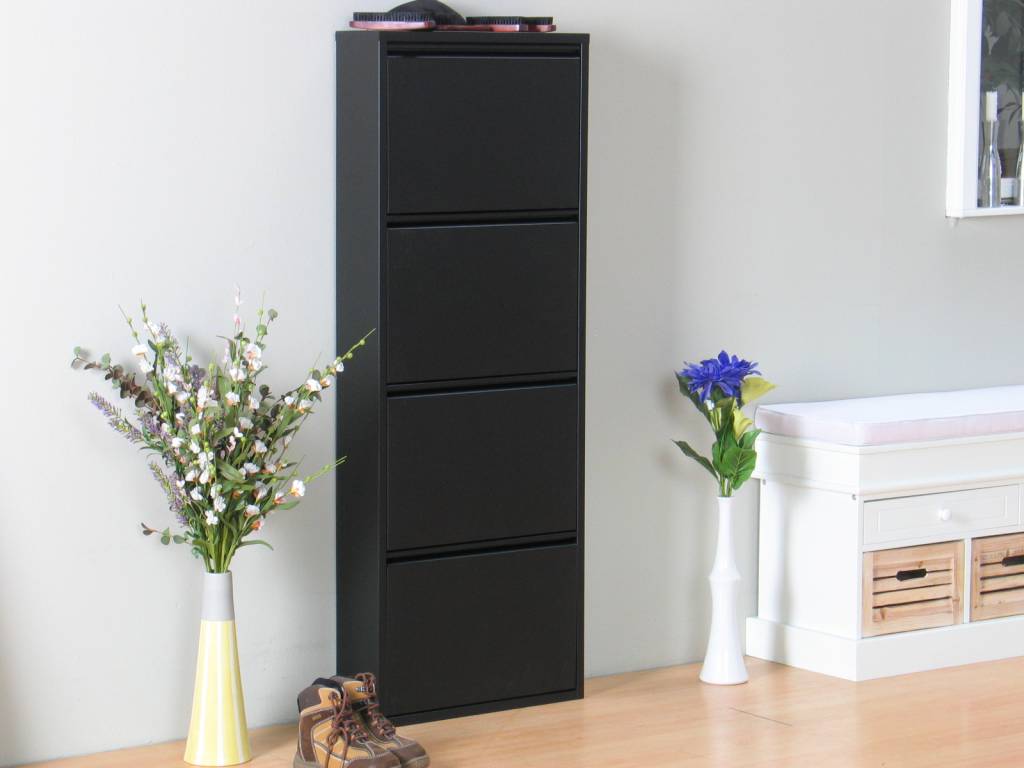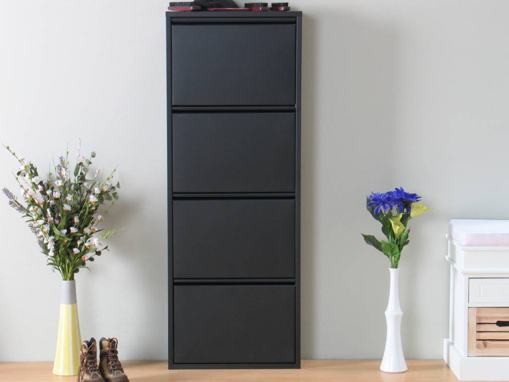 Zwarte schoenenkast met 4 kleppen, voor 8-12 paar schoenen, voortaan netjes opgeborgen! Een perfecte opruimoplossing voor in de hal, nu bij Hioshop voor de beste prijs in de markt. Ook verkrijgbaar met 3 of 5 kleppen, en in het wit!