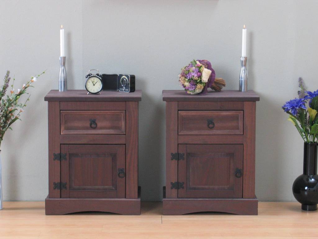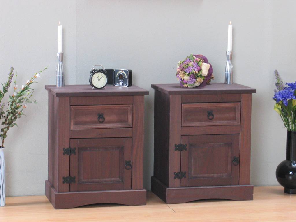 Set van 2 bruine nachtkastjes in Mexicaans grenen stijl. Leuke set nachtkastjes voor in uw slaapkamer, eventueel te combineren met een dressoir in de zelfde kenmerkende stijl. Ook in wit verkrijgbaar.