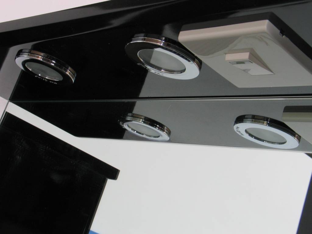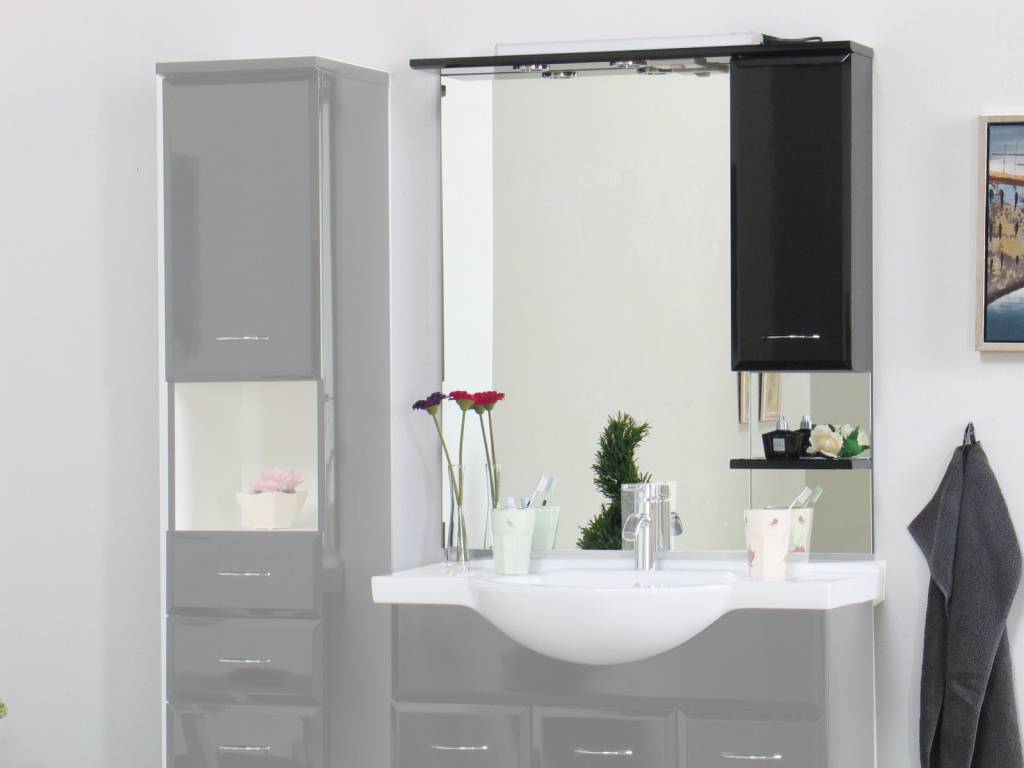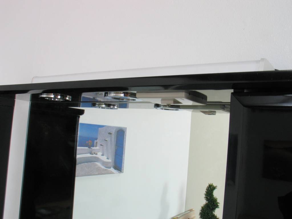 Prachtige spiegel om uw badkamer mee te completeren, voorzien van een grote centrale spiegel met daarboven een lichtkoof en 2 spotjes, en aan de rechterzijde nog een opbergkastje en opzetplank in zwart hoogglans.