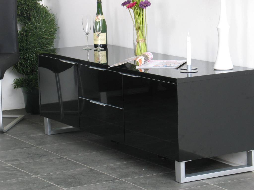 Stijlvol zwart hoogglans dressoir. Een kast van 60 cm breed en bijna 55 cm hoog: een echt kwaliteitsmeubel van MDF met metalen onderstel! Tevens verkrijgbaar in het wit, ook goed te gebruiken als tv meubel!