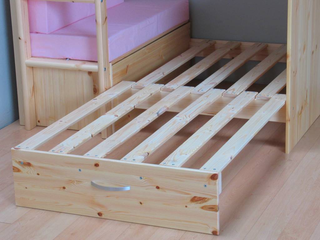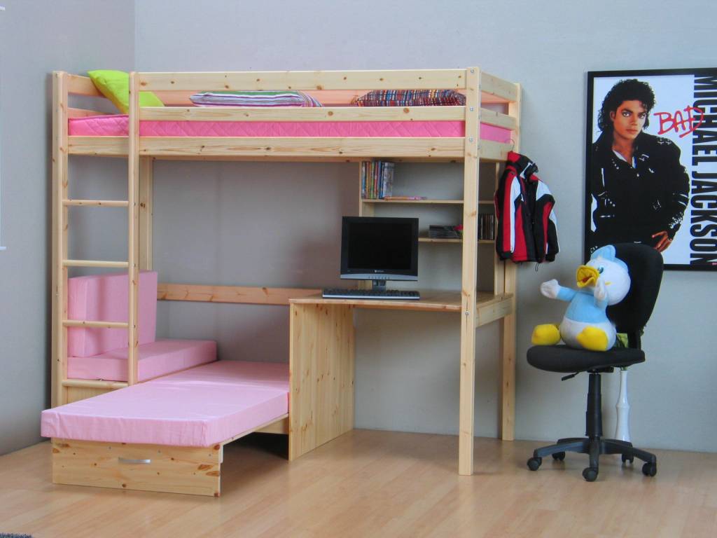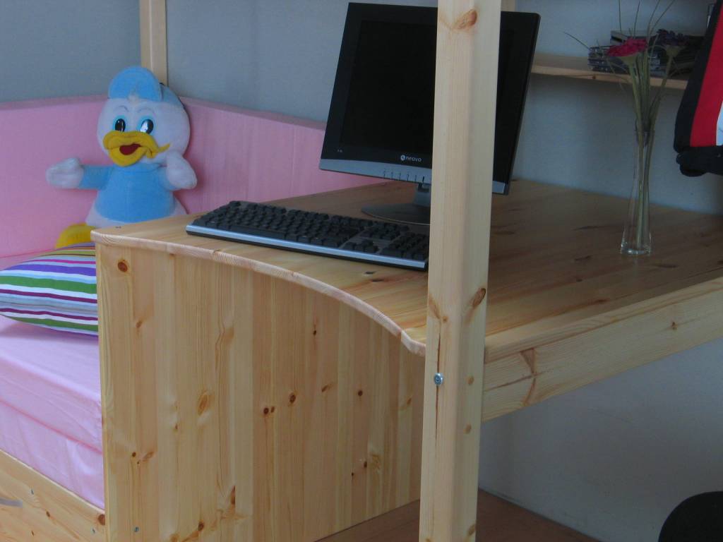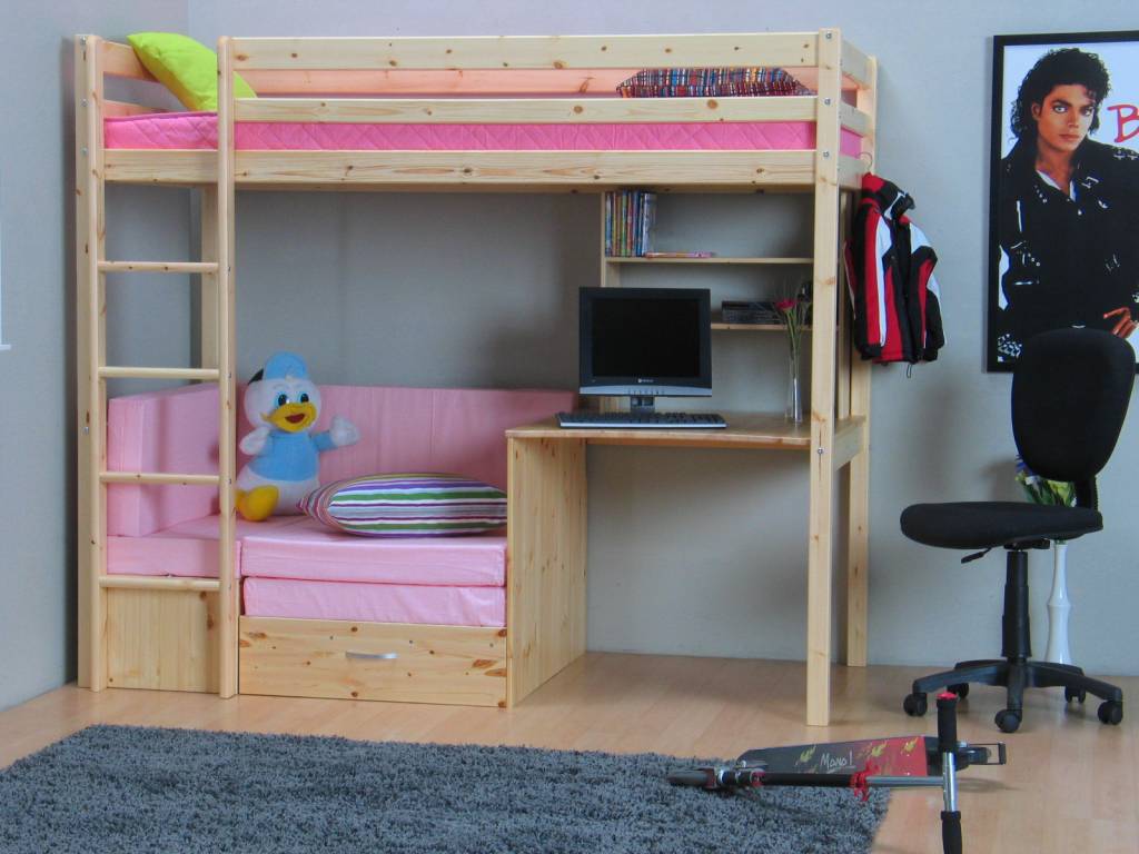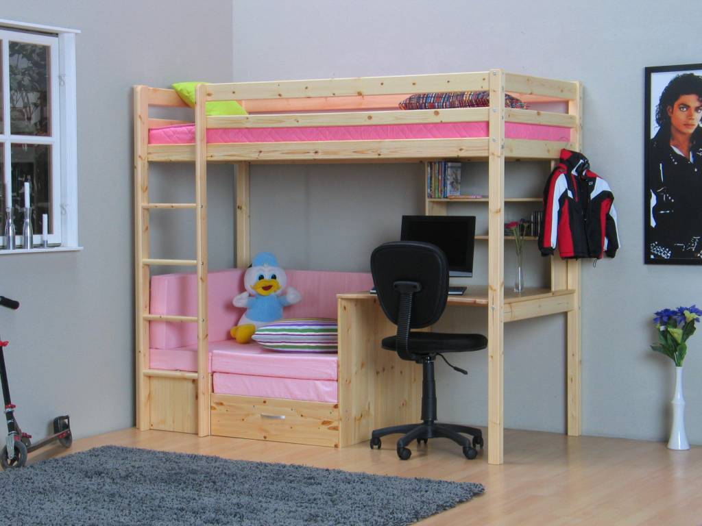 Grenen hoogslaper Floor Flex van de Deense kwaliteitsfabrikant Thuka! Dit complete meubel bestaat uit een hoogslaper met daaronder een bureau, uitschuif(slaap)bank, roze kussenset en opbergruimte. Nergens goedkoper!