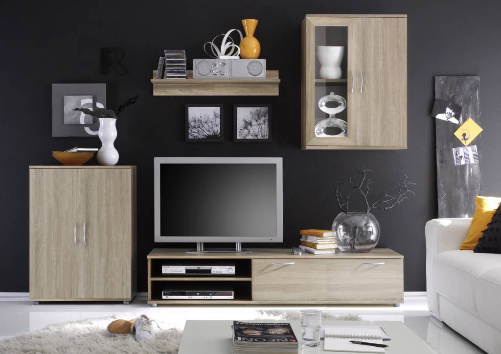 TV-wand Gate in eiken decor: 4 meubelelementen maken samen een mooie TV-wand: de wandplank om bijvoorbeeld leuke foto's op te zetten, een sierlijke staande en hangende kast met opbergruimte en natuurlijk het tv dressoir voor uw flatscreen! Spotprijs...