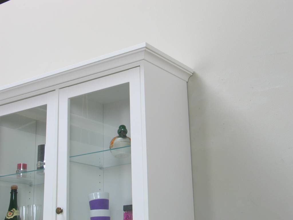 Boven: 3 glazen deuren met achter elk 2 glazen planken