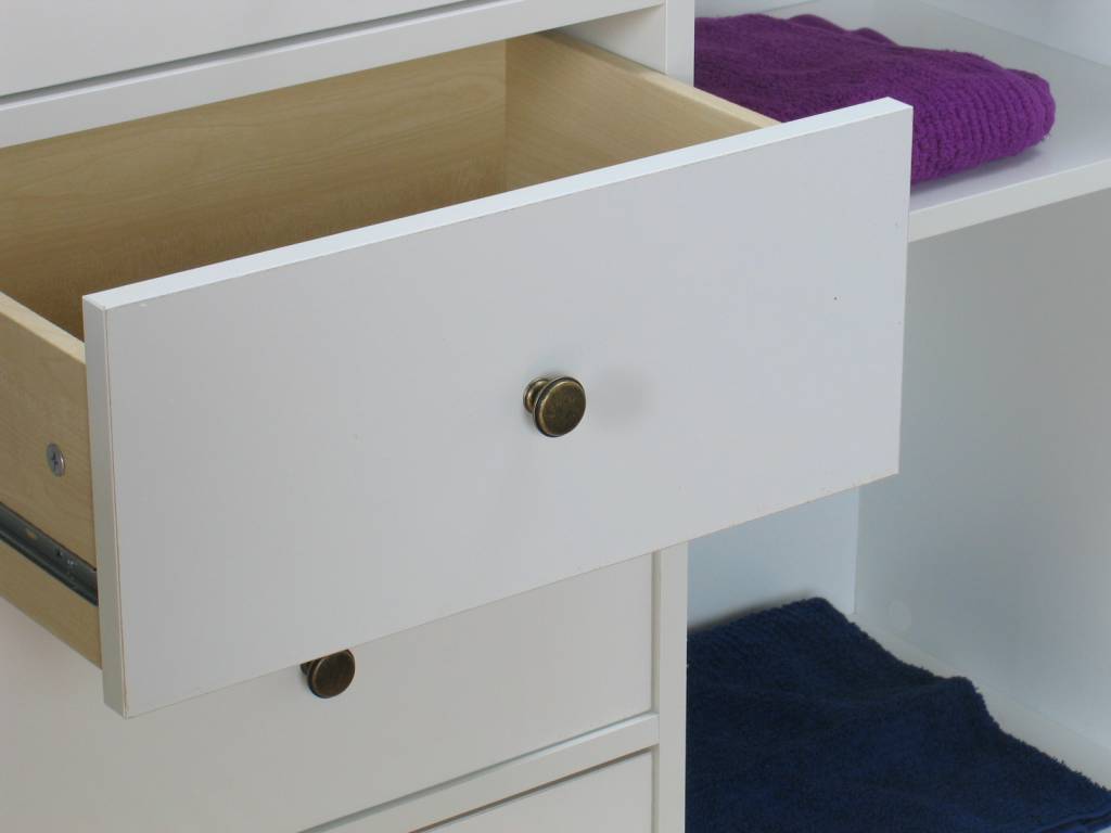 Onder: 4 laden. Rechts en links een deur met daarachter een opzetplank.