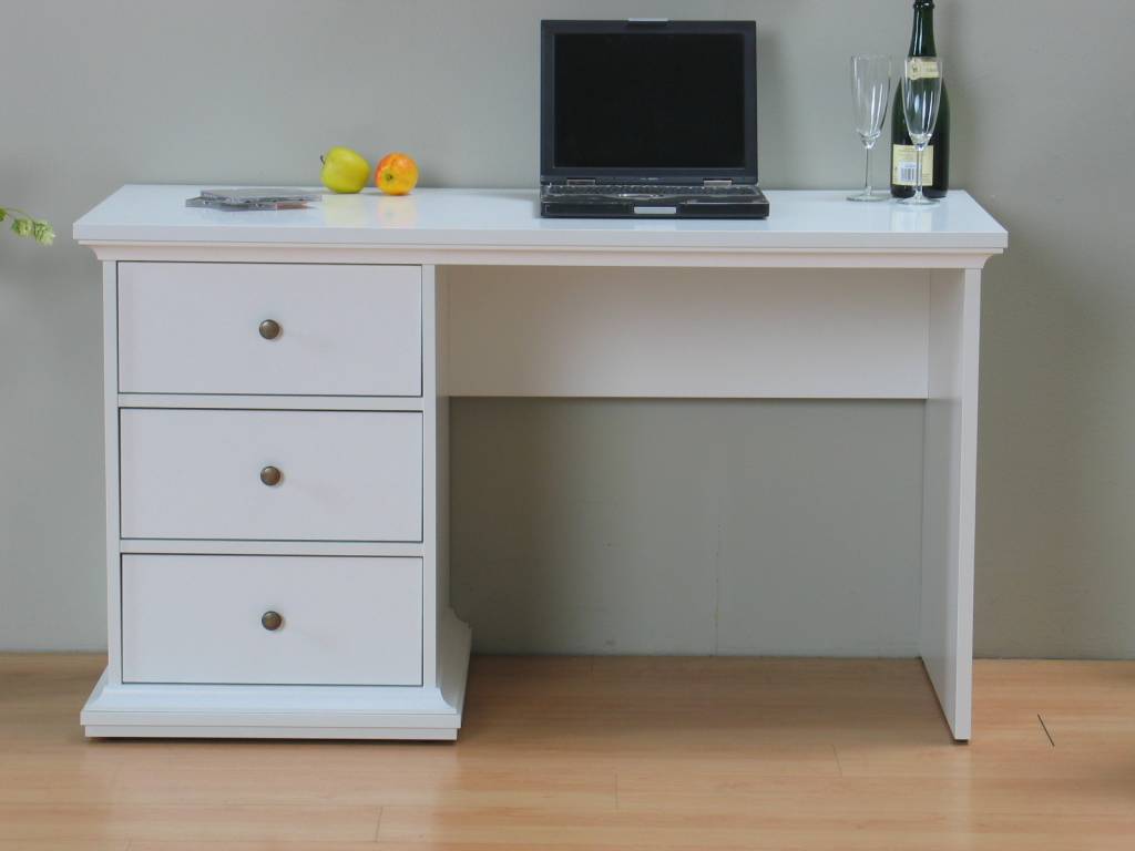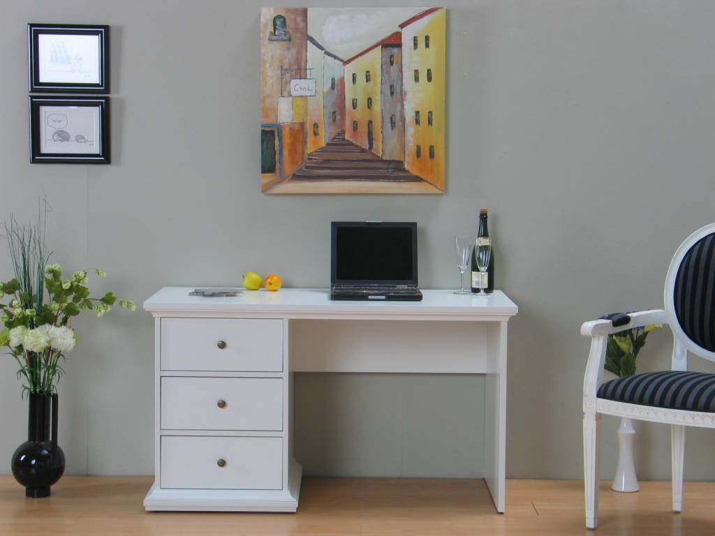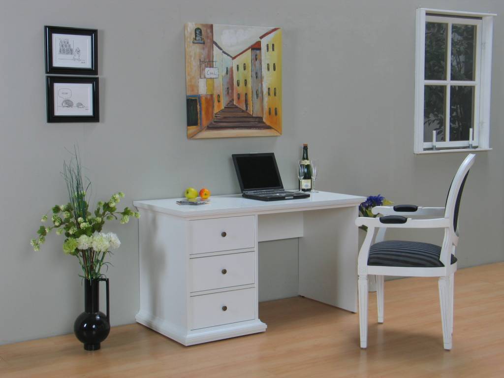 Wit bureau Venetië met 3 lades. Te gebruiken als bijvoorbeeld werkbureau of make-uptafel: perfect voor in de woonkamer of slaapkamer. Past goed bij de overige meubelen uit de serie Venetië! Sla dus nu uw slag!
