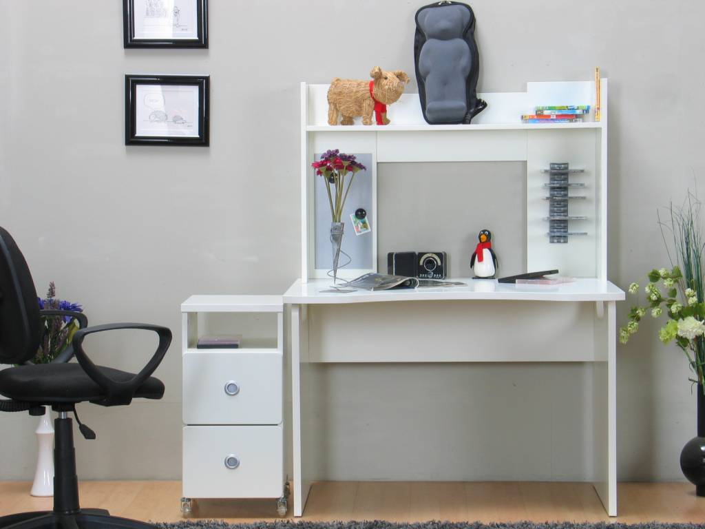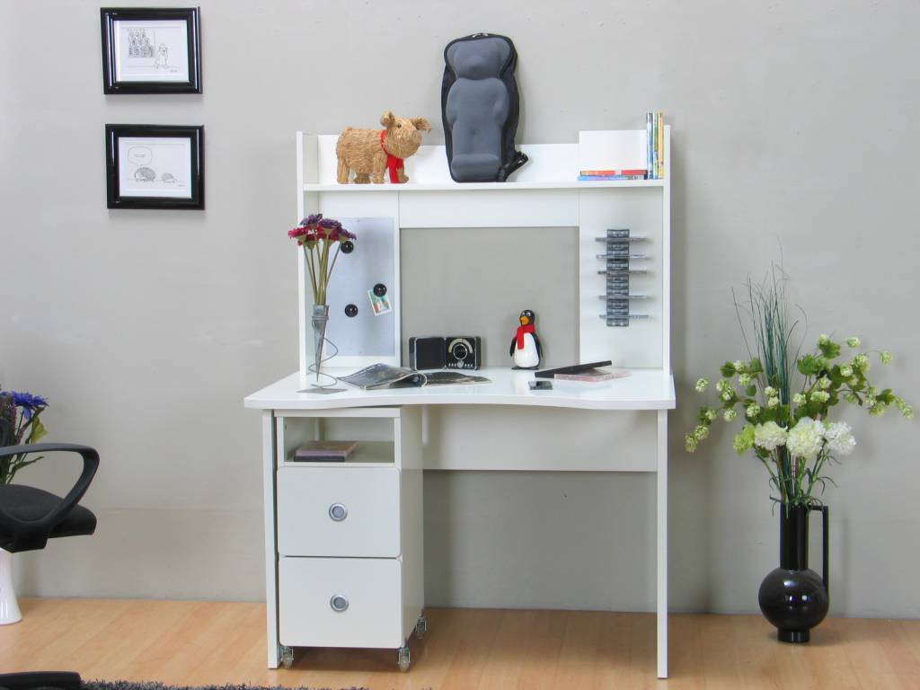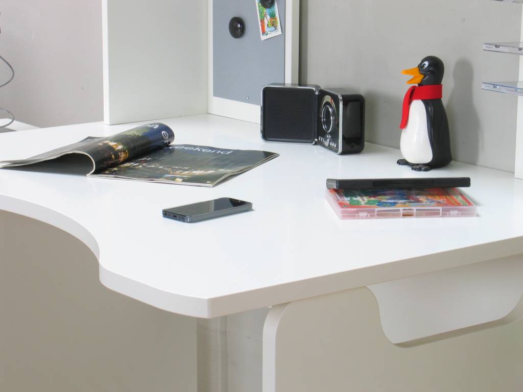 Bureau wit Jubee, bestaande uit een tafel met opzet en een ladekastje op wielen. Zeer geschikt voor op de werkkamer of slaapkamer dus! Bovendien heeft de opzet een magneetbord links en een CD-houder rechts.